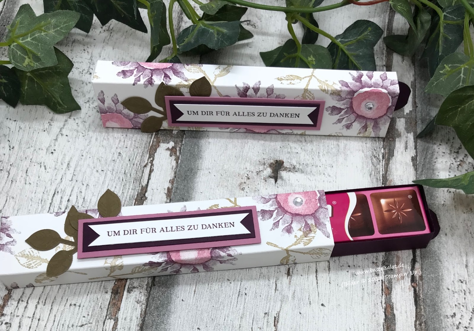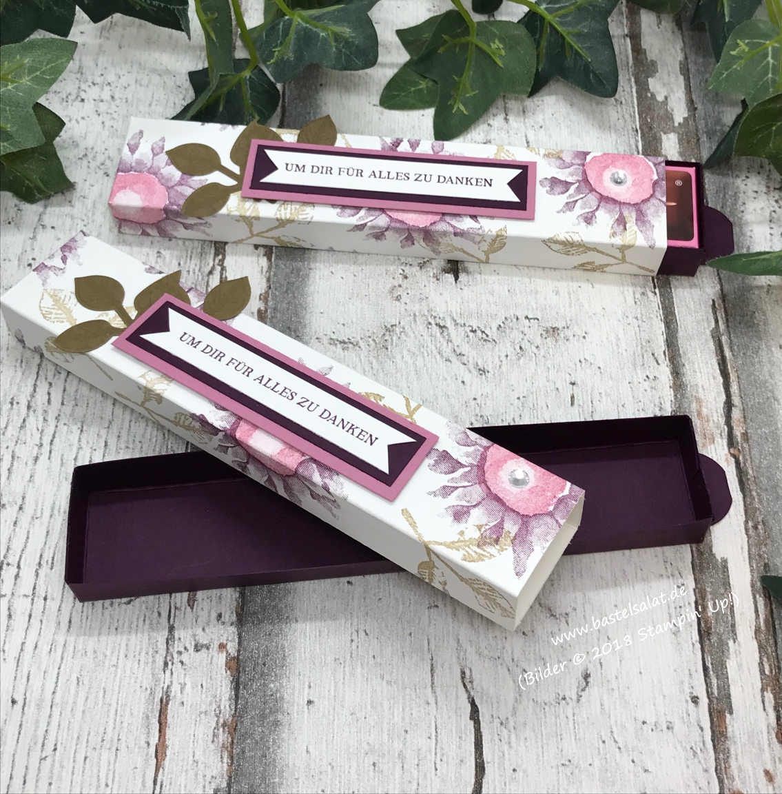 Bei dieser herbstliche Ziehverpackung ist die Farbauswahl auf „Brombeermousse“, „Zarte Pflaume“ und „Wildleder“ gefallen. Das Designerpapier habe ich mir mit dem tollen Stempelset „Herbstanfang“ selber gemacht.