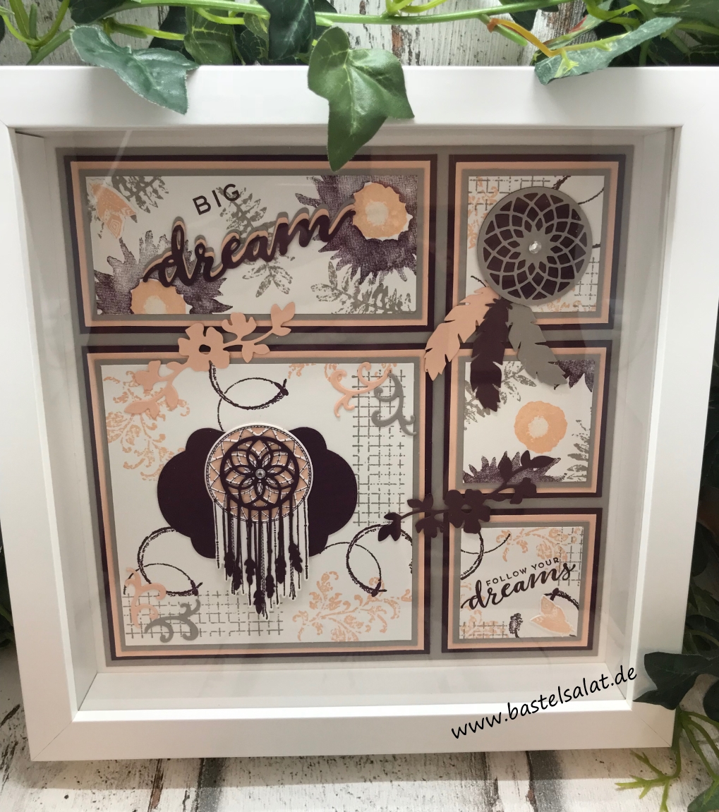 … Dreams ist ein super schönes Produktpaket – Stempelset „Follow your Dreams“ + darauf abgestimmte Framelits Formen „Traumfänger – aus dem aktuellen Jahreskatalog (S. 54) in das ich mich direkt beim ersten durchblättern verguckt hatte und bei der Gestaltung für diesen Rahmen zum Einsatz kam.
