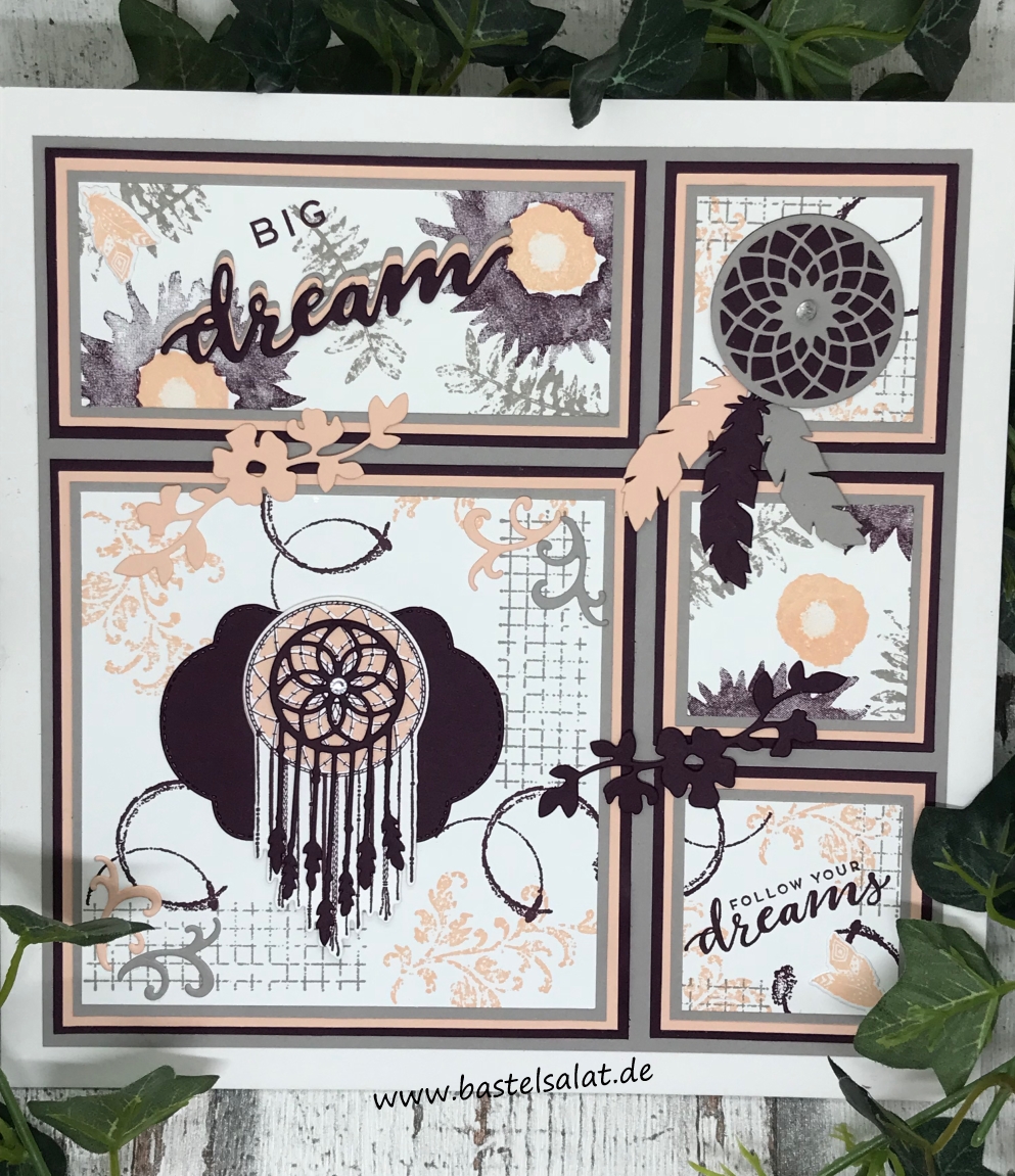 … Dreams ist ein super schönes Produktpaket – Stempelset „Follow your Dreams“ + darauf abgestimmte Framelits Formen „Traumfänger – aus dem aktuellen Jahreskatalog (S. 54) in das ich mich direkt beim ersten durchblättern verguckt hatte und bei der Gestaltung für diesen Rahmen zum Einsatz kam.