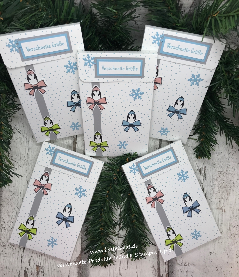 Bei der Verpackung habe ich Cardstock in Flüsterweiß, Babyblau und Schiefergrau, die Stempelsets „Es schneit!“, „Wintermärchen“, „Zuckersüsse Weihnachten“ + „Making Every Day Bright“,