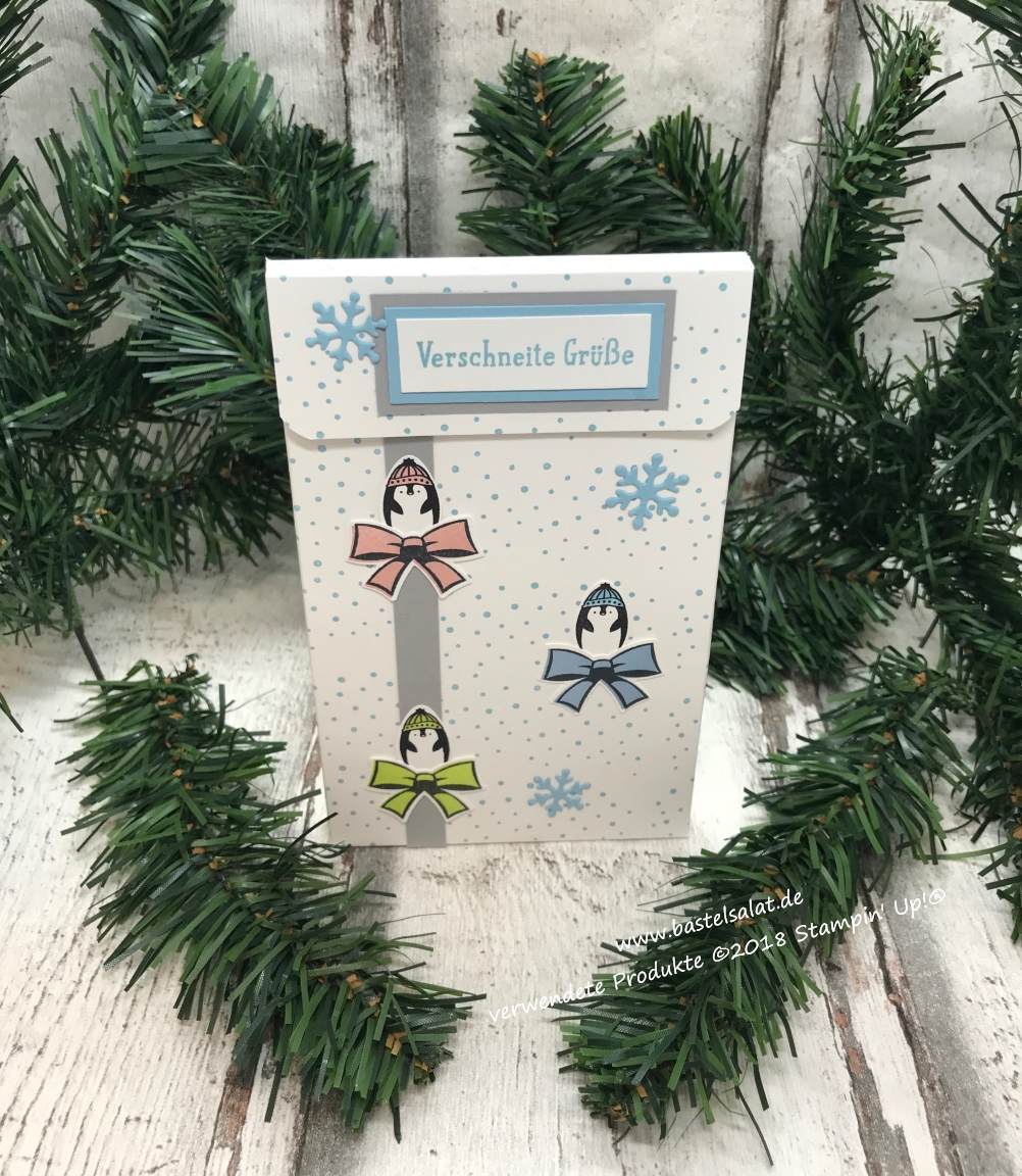 Bei der Verpackung habe ich Cardstock in Flüsterweiß, Babyblau und Schiefergrau, die Stempelsets „Es schneit!“, „Wintermärchen“, „Zuckersüsse Weihnachten“ + „Making Every Day Bright“,