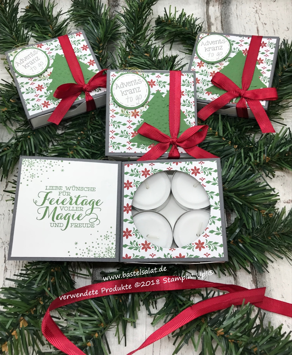 Für meine Märkte ist eine Verpackung für 4 Teelichter – auch unter dem Namen „Adventskranz to Go“ bekannt, von meinem Basteltisch gehüpft.