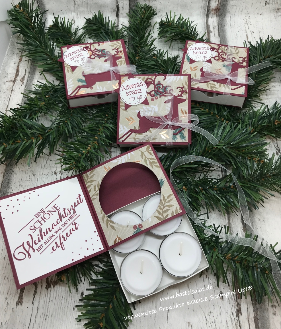 Für meine Märkte ist eine Verpackung für 4 Teelichter – auch unter dem Namen „Adventskranz to Go“ bekannt, von meinem Basteltisch gehüpft.