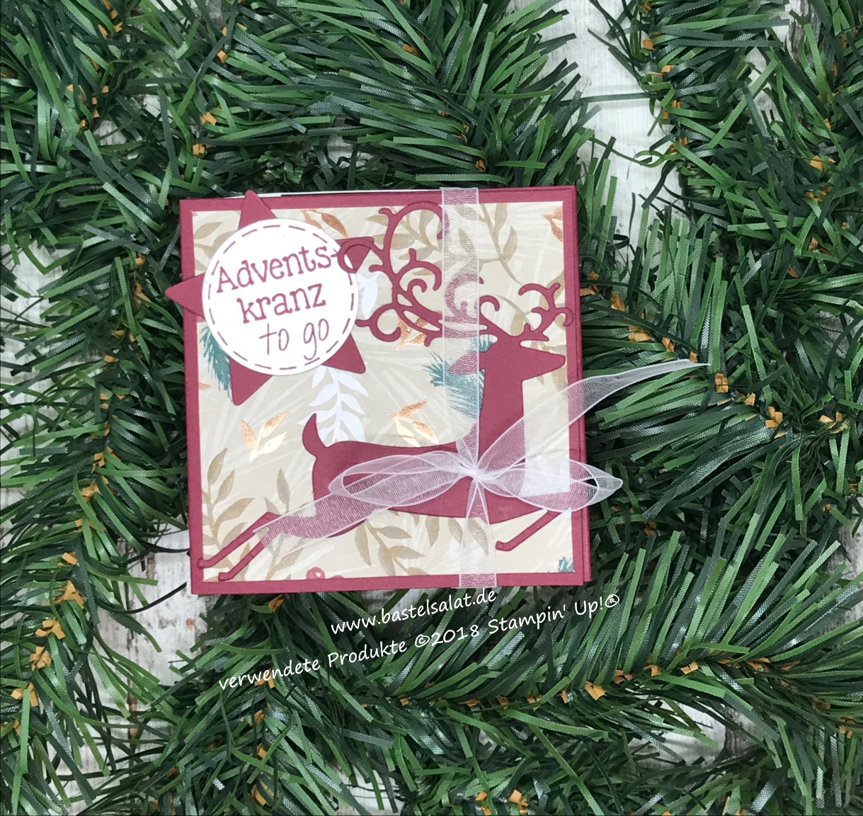 Bei dieser Variante habe ich mit Cardstock in „Merlotrot“, dem besonderen DSP „Weihnachtszeit“, den Stempelsets „Wintermärchen“ + „Weihnachtliche Vielfalt“, sowie den Thinlits „Weihnachtswild“