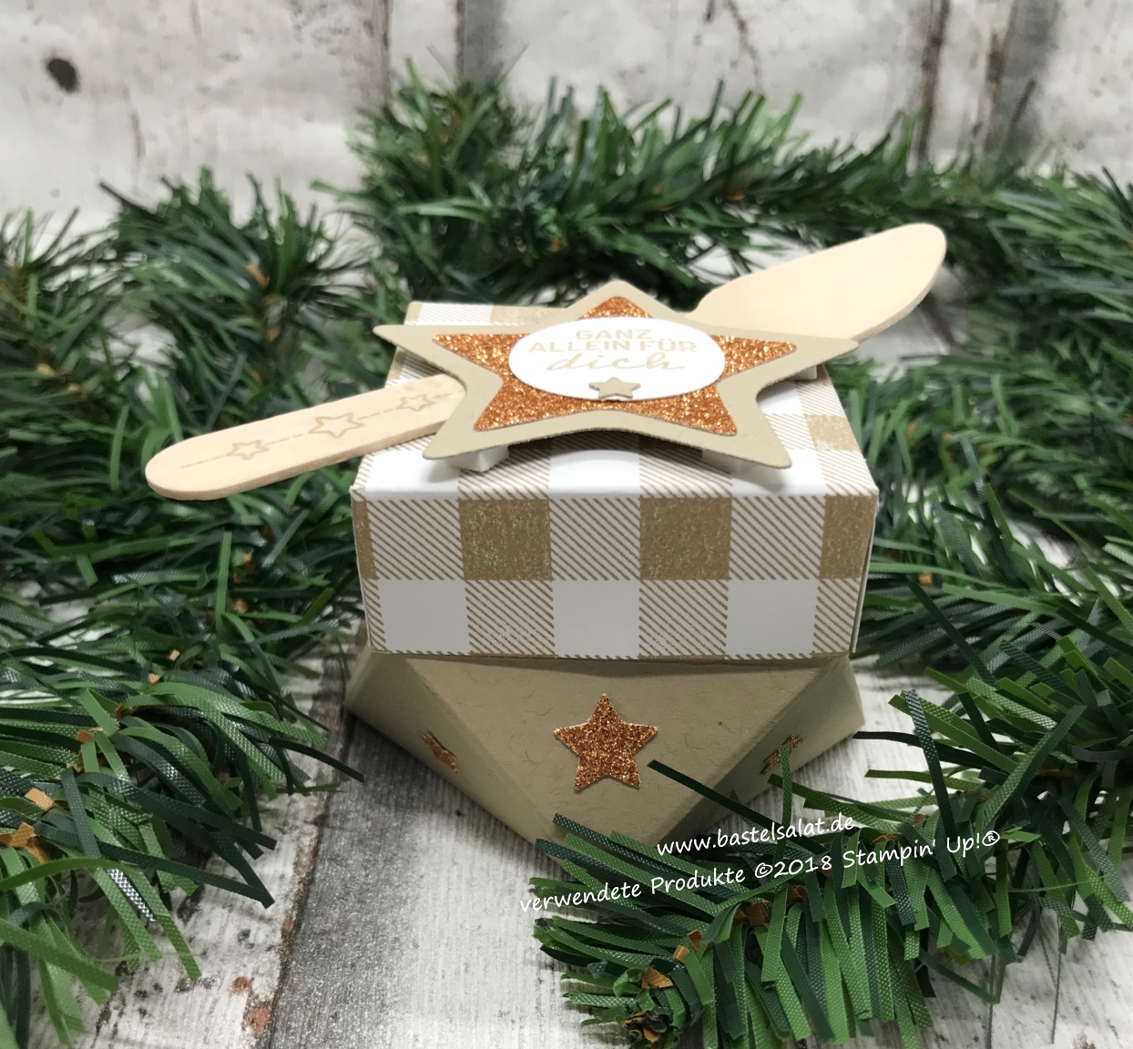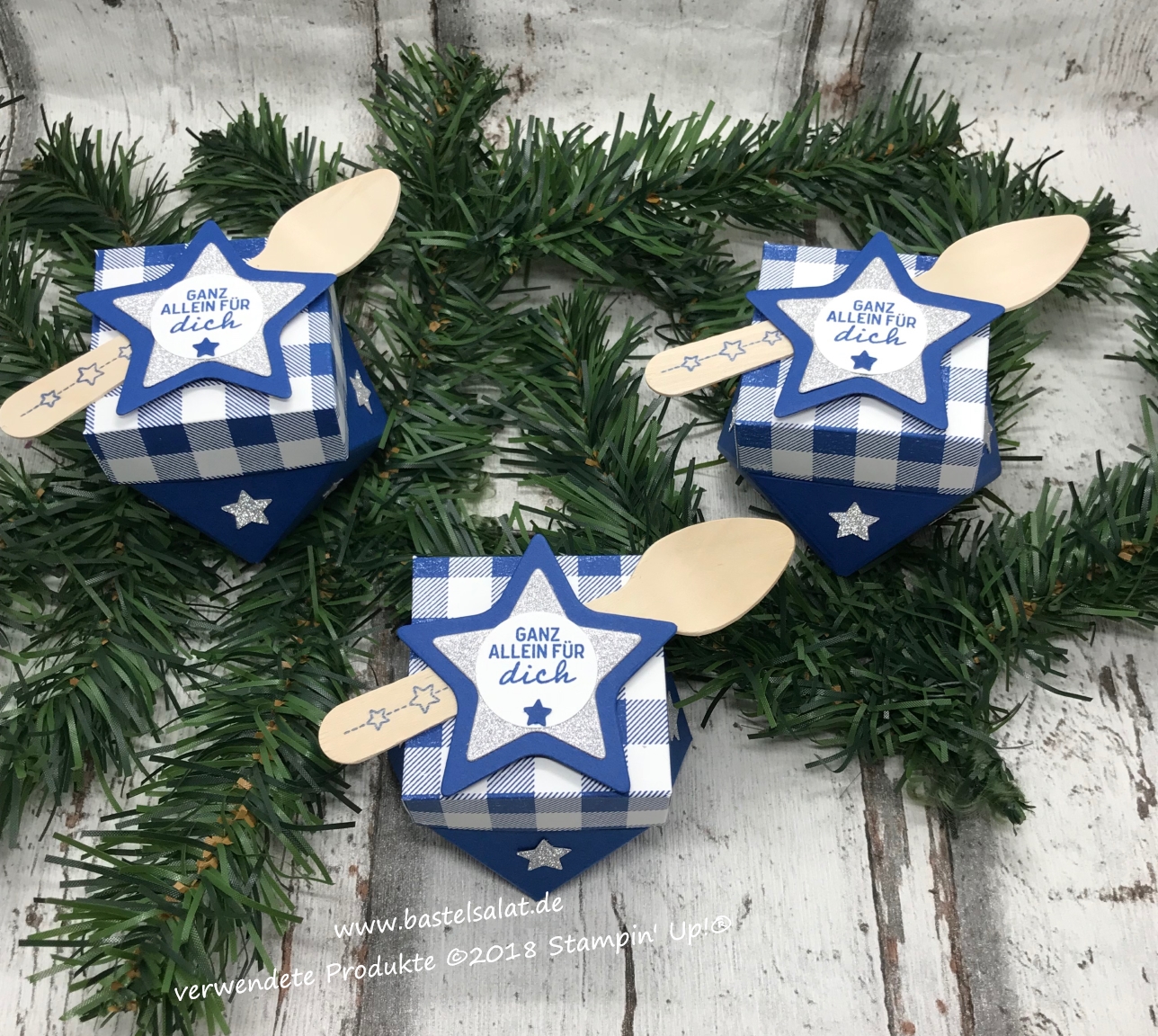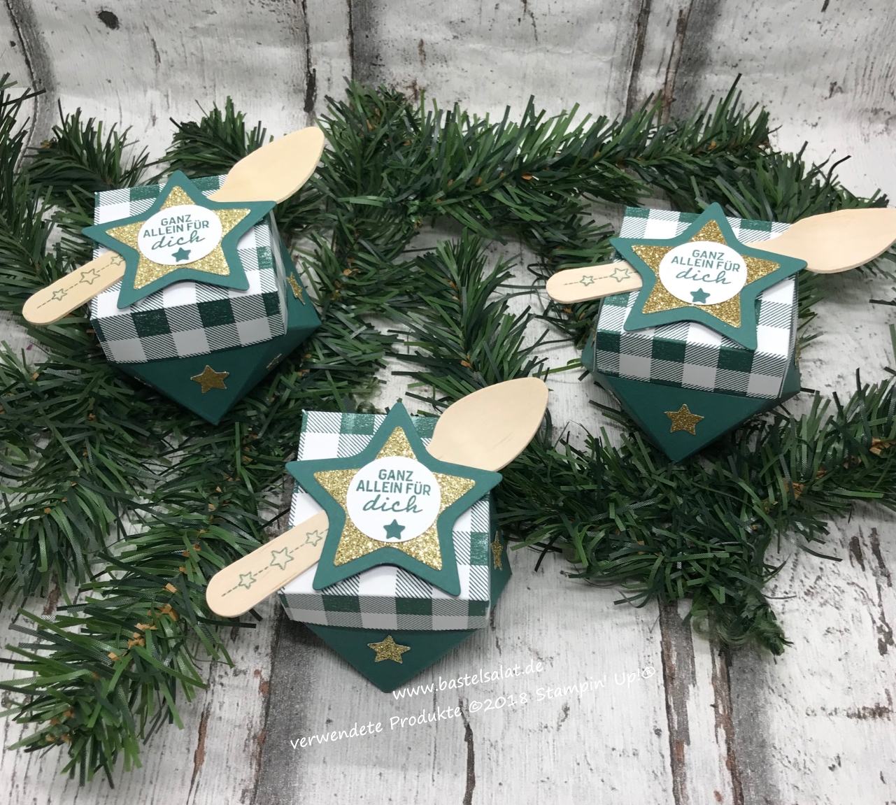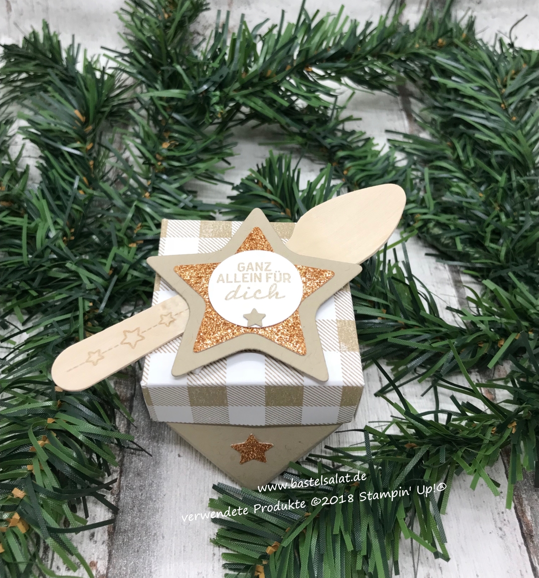 Die Stempelsets „Buffalo Check“, „Leuchtende Weihnachten“ (damit habe ich die Löffel bestempelt) und „Süße Adventsgrüße“, sowie die Elementstanze „Mond und Sterne“, habe ich bei diesen niedlichen Boxen verwendet.