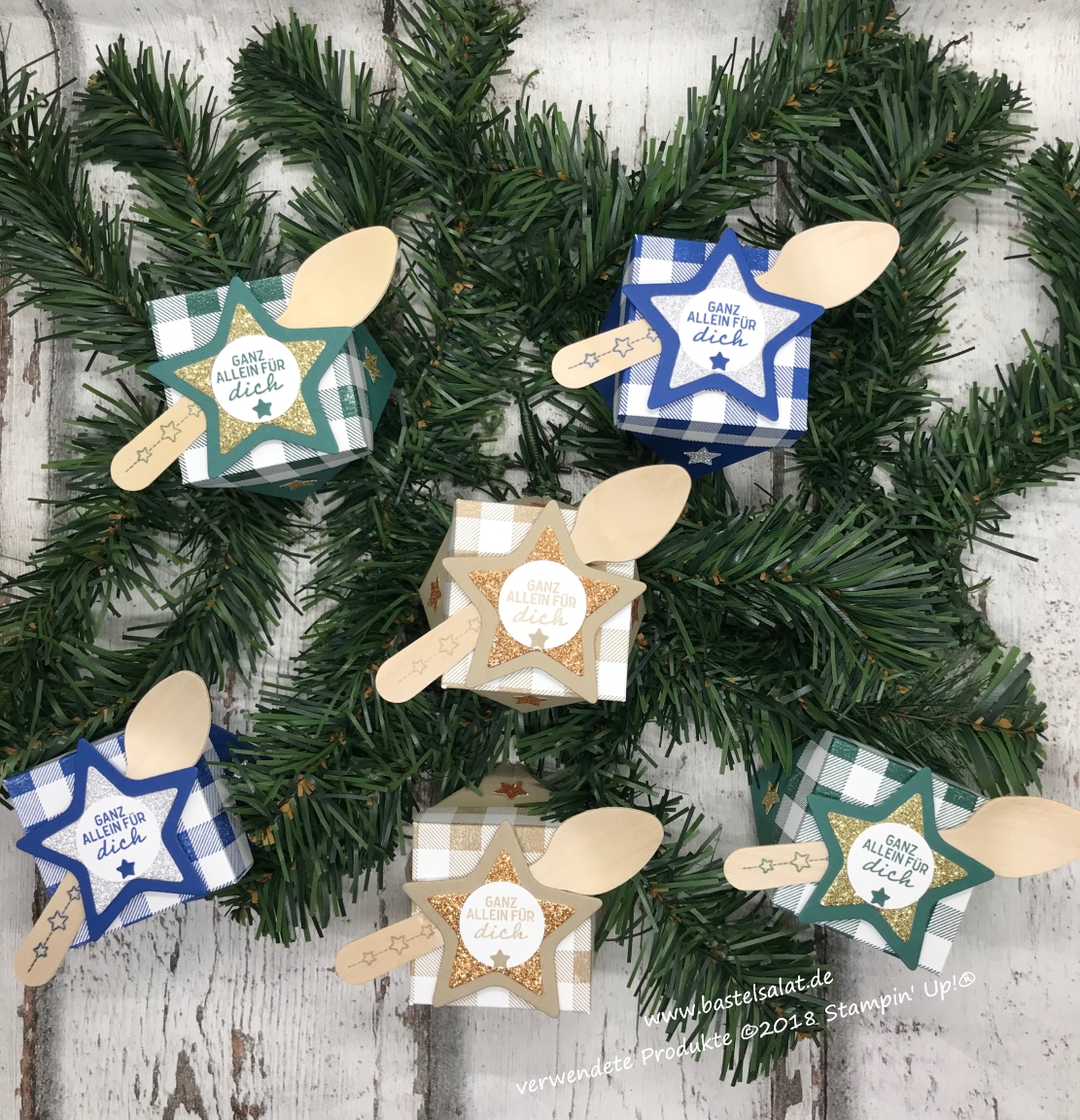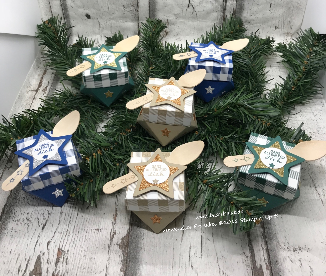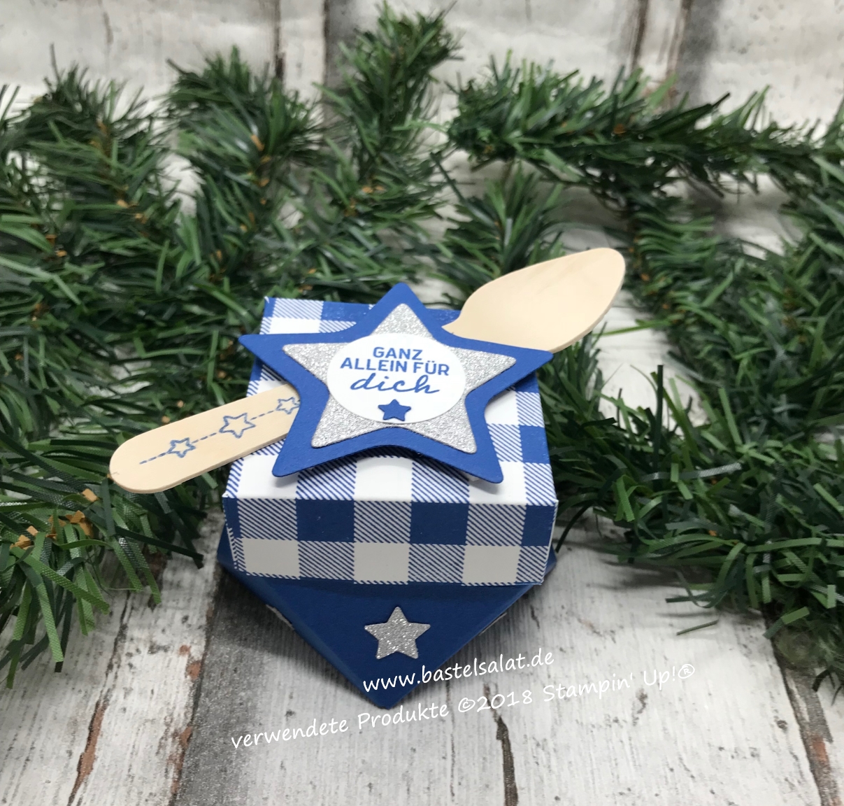 Die Stempelsets „Buffalo Check“, „Leuchtende Weihnachten“ (damit habe ich die Löffel bestempelt) und „Süße Adventsgrüße“, sowie die Elementstanze „Mond und Sterne“, habe ich bei diesen niedlichen Boxen verwendet.