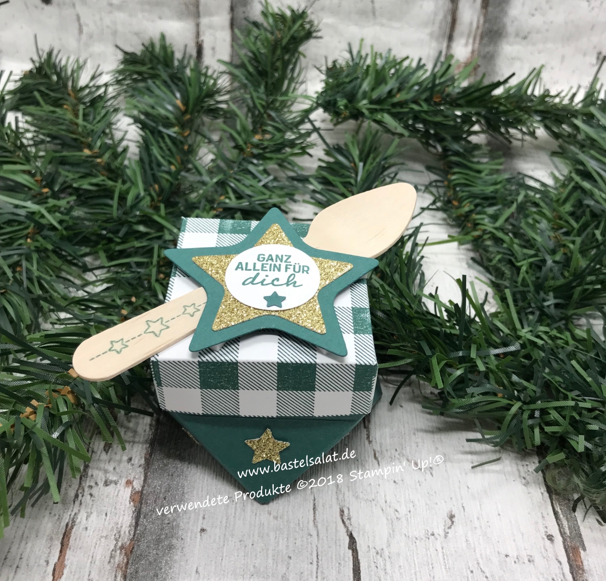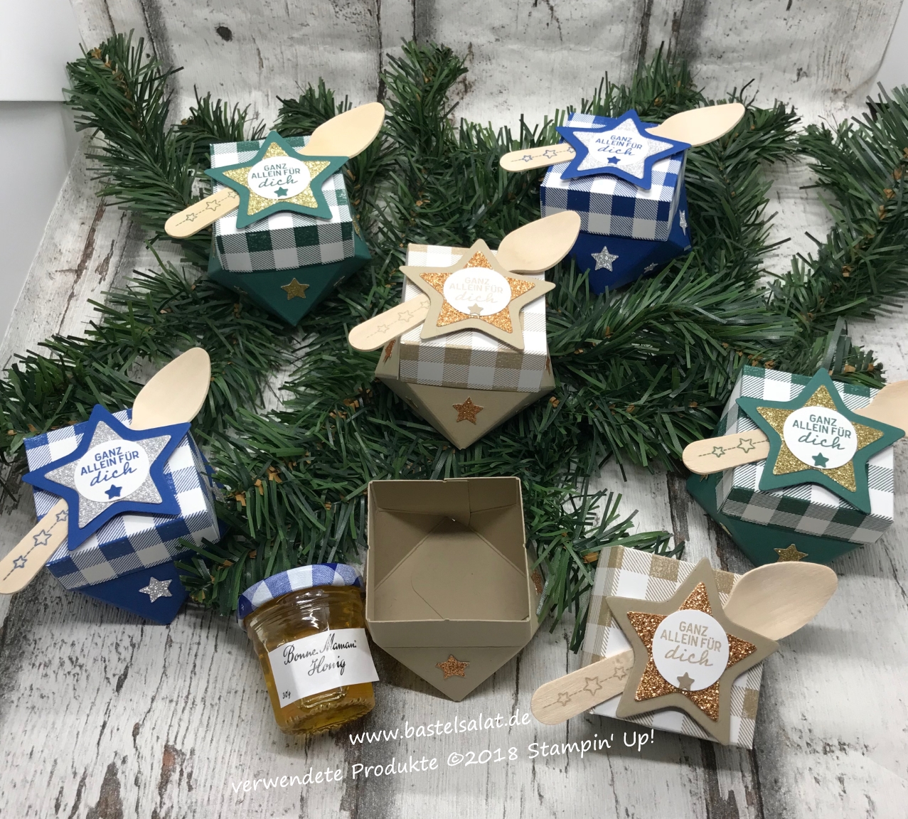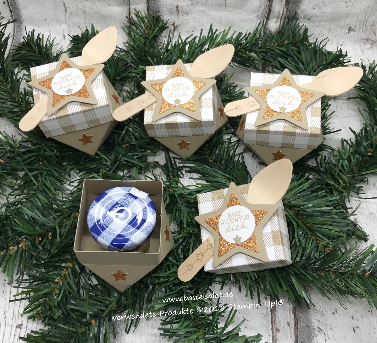 Die Stempelsets „Buffalo Check“, „Leuchtende Weihnachten“ (damit habe ich die Löffel bestempelt) und „Süße Adventsgrüße“, sowie die Elementstanze „Mond und Sterne“, habe ich bei diesen niedlichen Boxen verwendet.
