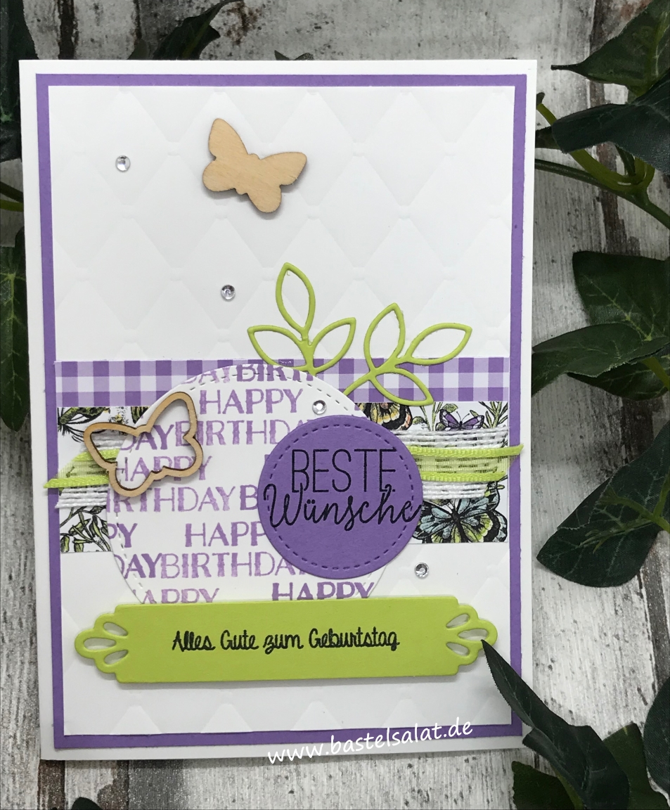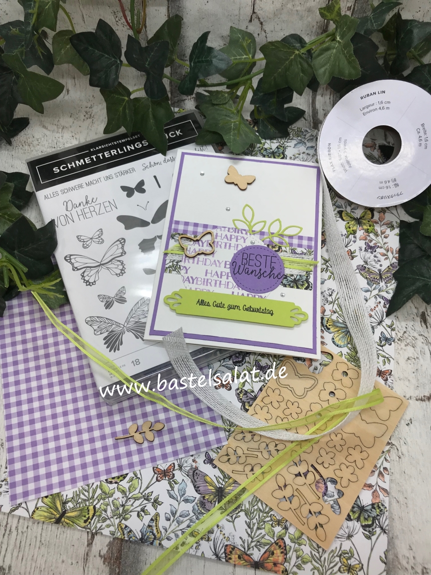 Das total schöne Designerpapier mit den Schmetterlingen heißt „Schmetterlingsvielfalt“ und ist wie die tollen Schmetterlingsapplikationen aus Holz „Akzente Schmetterlinge“ und das Organdy Band jeweils ein Produkt aus der Sale-A-Bration Broschüre.