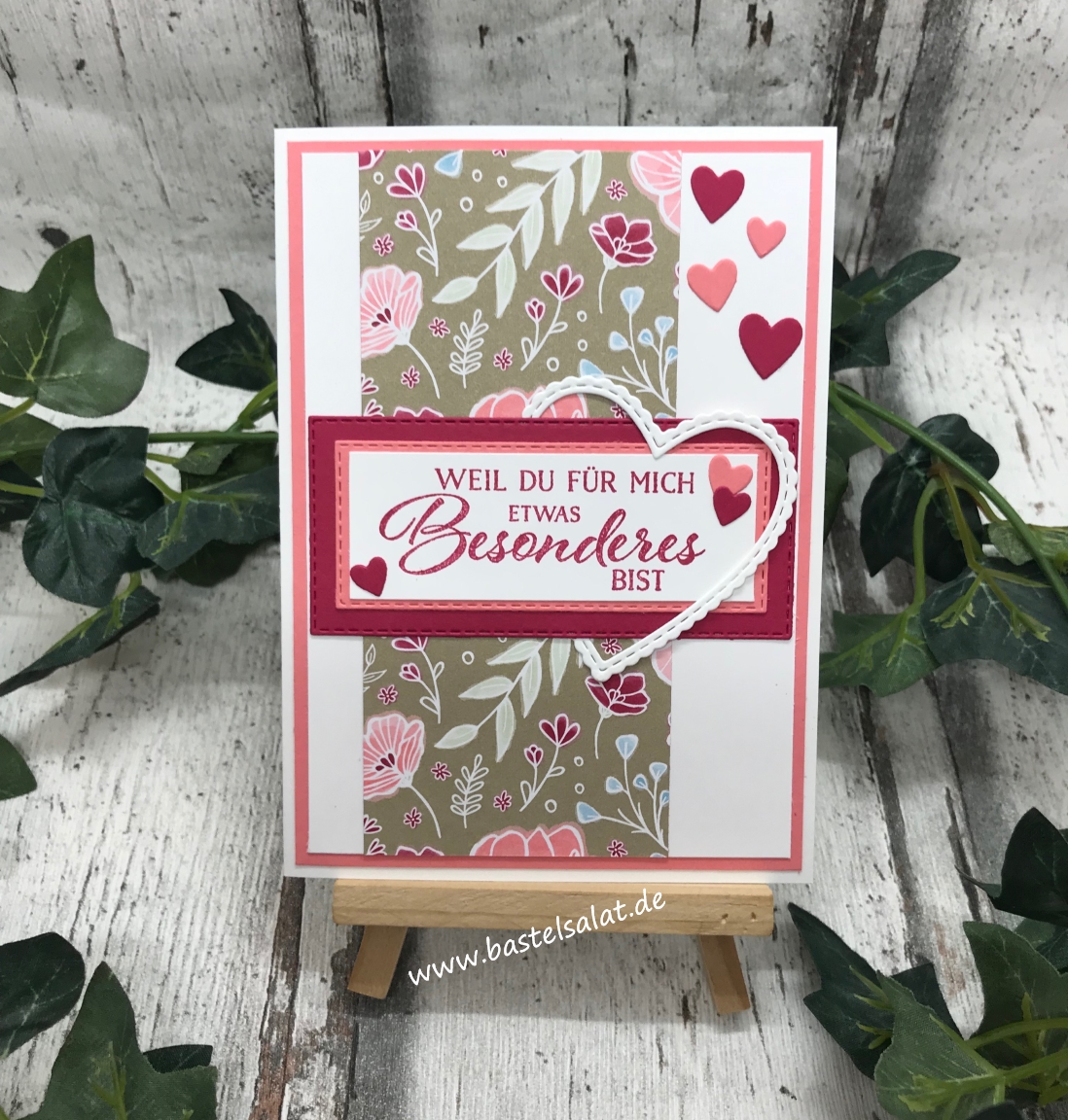 das Designerpapier „In Liebe“, sowie Cardstock in Flüsterweiß, Flamingorot und Kussrot verwendet.