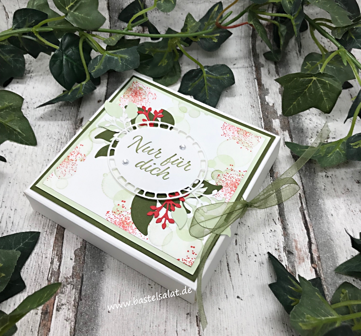 An der rechten Seite wird die Verpackung noch zusätzlich mit einem Schleifenband verschlossen. Aber was macht man wenn man gerade kein passendes Band da hat? Man nimmt sich ein Stück weißes Schleifenband und färbt dieses mit den Stampin‘ Blends einfach in der gewünschte Farbe ein.