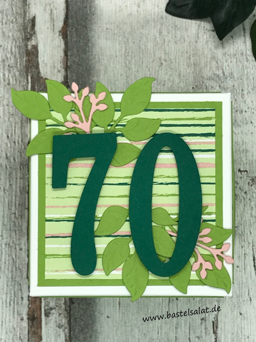 Bei dieser 7 cm x 7 cm große Explosionsbox habe ich Cardstock in Grüner, Apfel, Tannengrün, Kirschblüte und Flüsterweiß, das Designer Papier Traumhaft Tropisch,