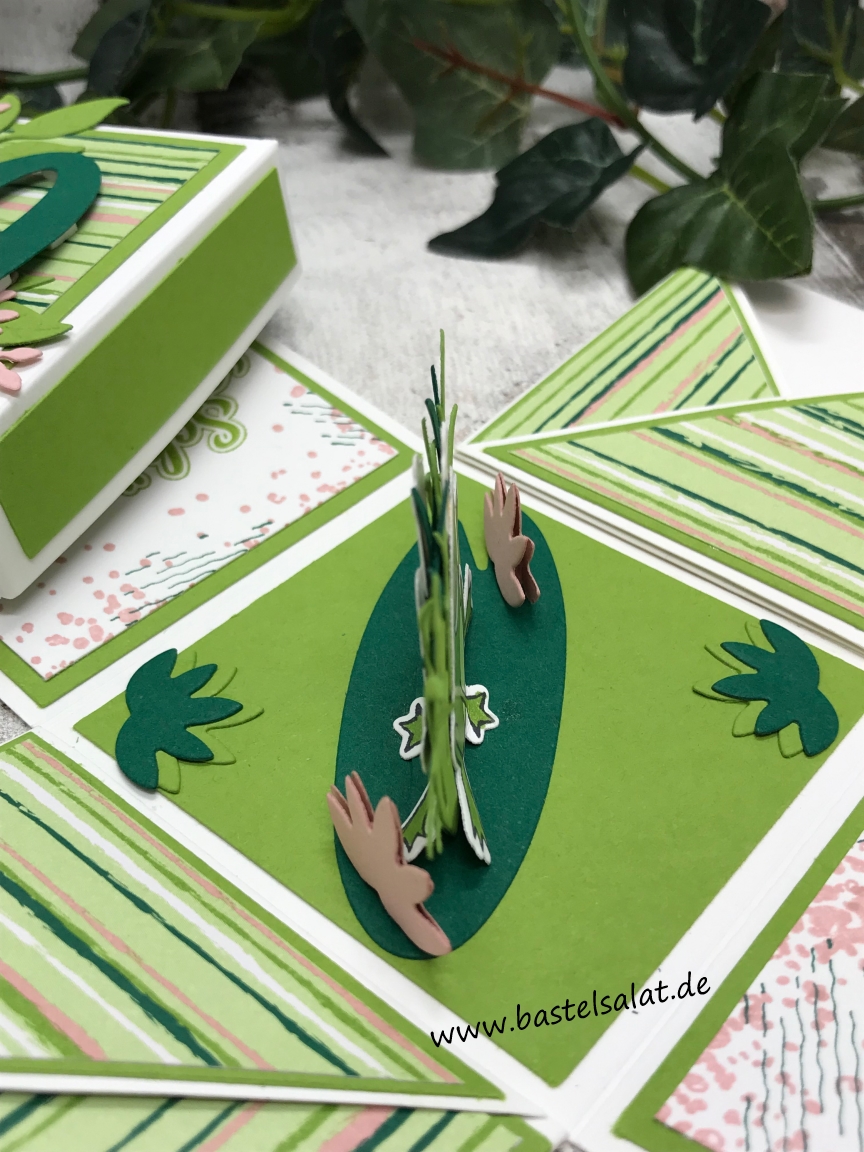 Bei dieser 7 cm x 7 cm große Explosionsbox habe ich Cardstock in Grüner, Apfel, Tannengrün, Kirschblüte und Flüsterweiß, das Designer Papier Traumhaft Tropisch,