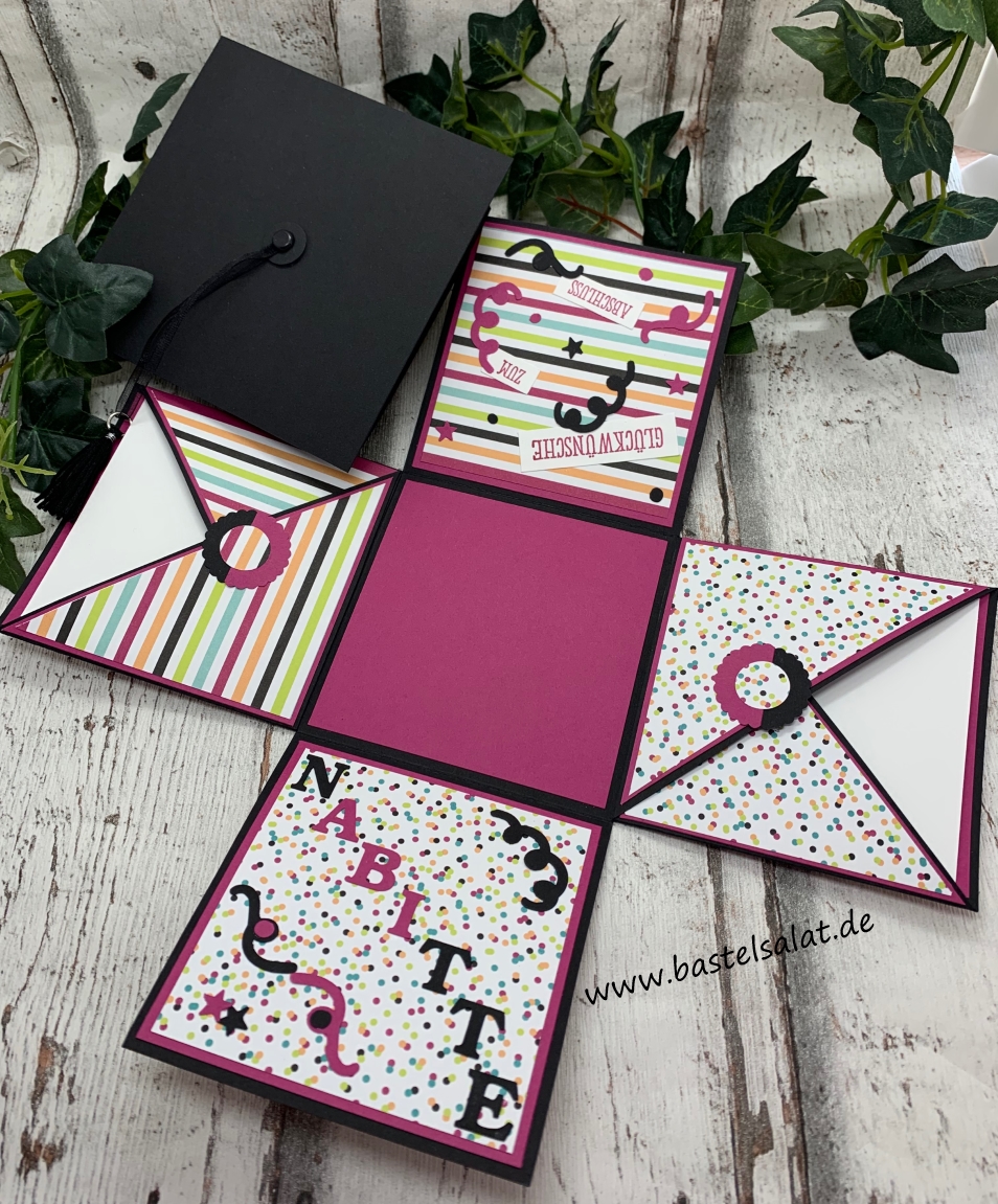 Beim dekorieren/gestalten der Box habe ich mit dem Designer Papier „Perfekte Party“, Farbkarton in Sommerbeere, dem Stempelset „Gut gesagt“, der Konfetti und Wellenkreis Stanze,