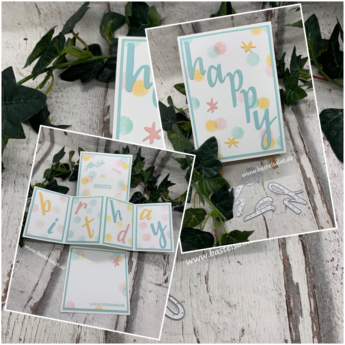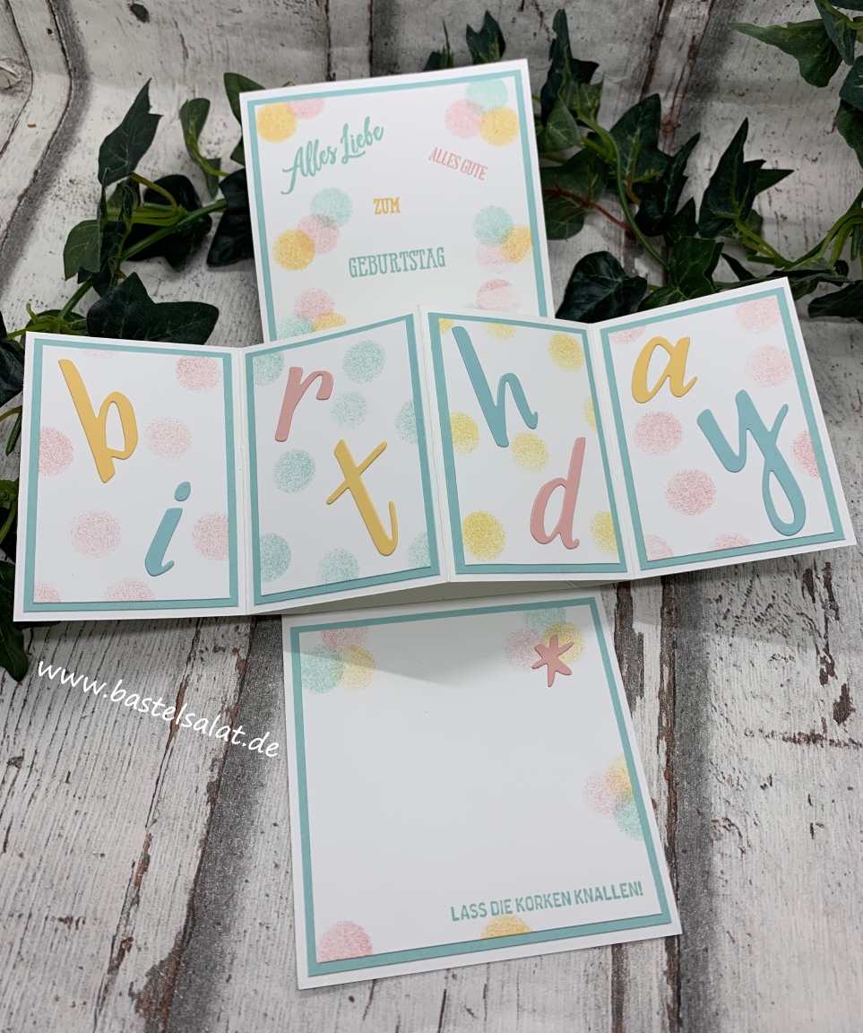 Bei dieser Karte habe ich Farbkarton in Flüsterweiß, Aquamarin, Safrangelb und Kirschblüte, Stempelkissen Aquamarin, Safrangelb + Kirschblüte, Fingerschwämmchen, das neue Stempelset Jahr voller Grüße sowie die Stempelsets Geburtstagsmix + Gut gesagt und die tollen neuen Stanzformen Handgeschrieben verwendet.