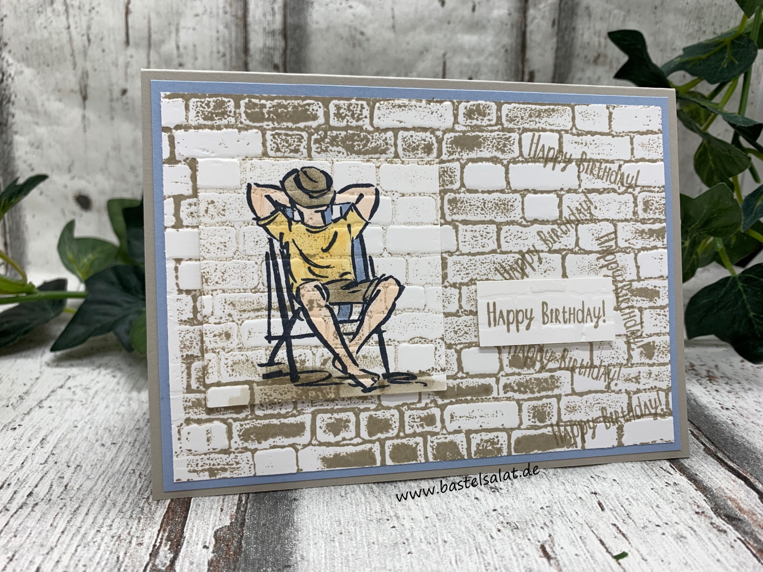 Der chilldende Herr ist zuerst mit Memento aufgestempelt, mit einer Stanzform aus Lagenweise Quadrate ausgestanzt, mit Stampin‘ Blends in Rauchblau, Safrangelb, Granit und Savanne coloriert und anschließend ebenfalls mit der 3D Prägeform Mauerwerk geprägt worden.