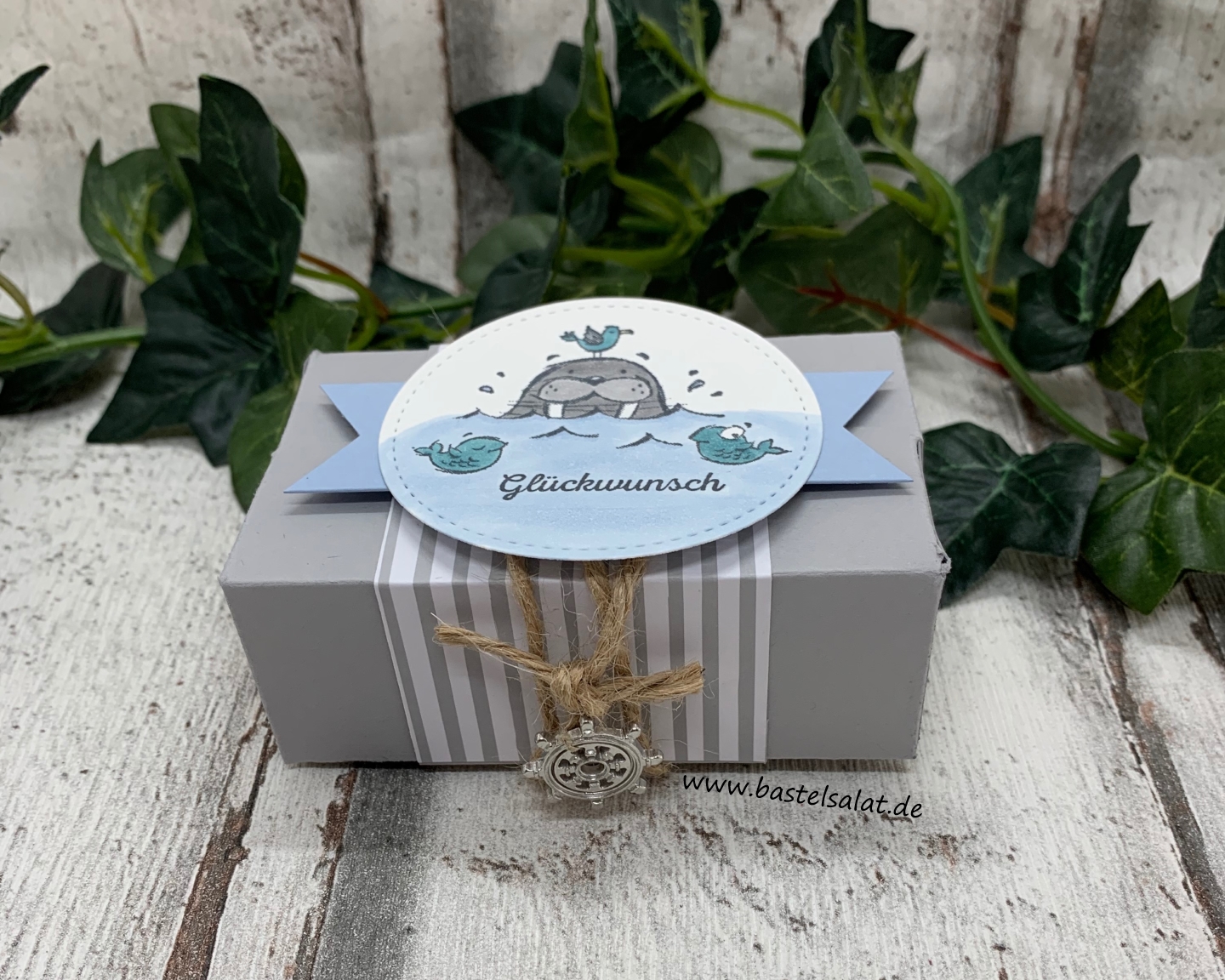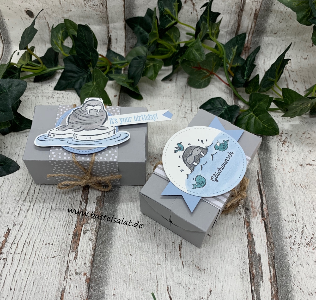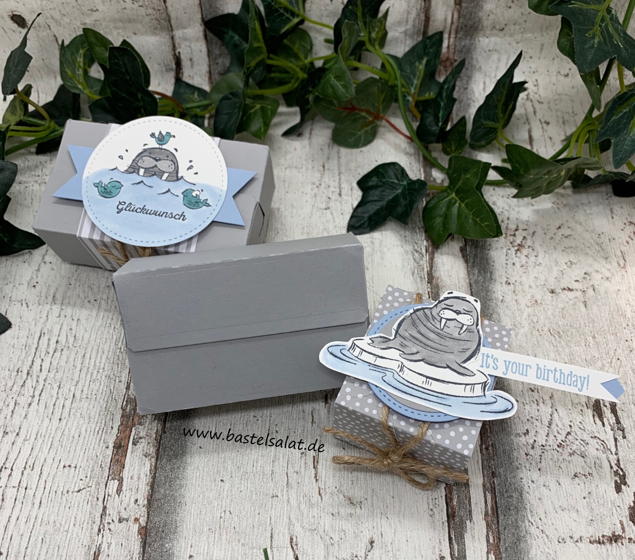 Meine Päckchen sind aus Schiefergrauem Farbkarton entstanden. Bei der Deko habe ich das neue Stempelset We’ll Walrus be Friends, das Stempelset Klitzekleine Grüße, Stampin‘ Blends in Schiefergrau, Rauchblau und Pfauengrün,