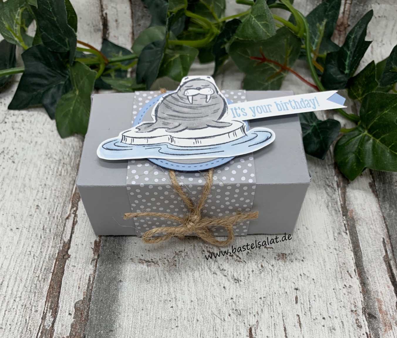 Meine Päckchen sind aus Schiefergrauem Farbkarton entstanden. Bei der Deko habe ich das neue Stempelset We’ll Walrus be Friends, das Stempelset Klitzekleine Grüße, Stampin‘ Blends in Schiefergrau, Rauchblau und Pfauengrün,
