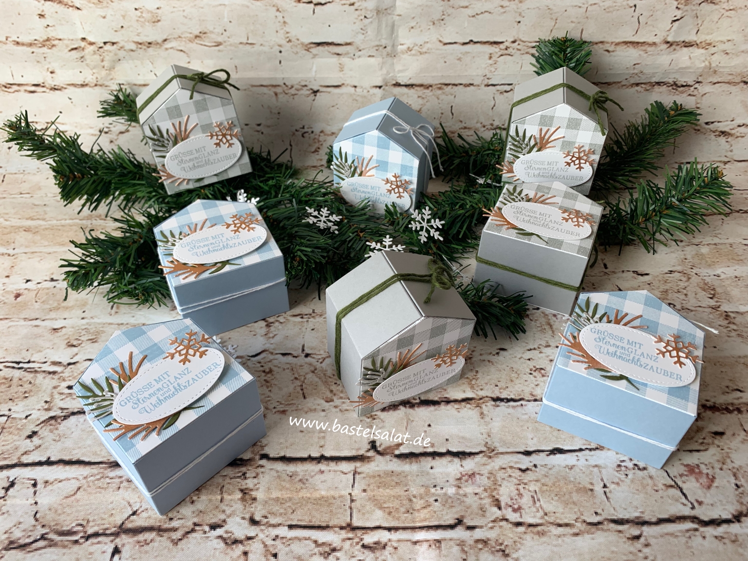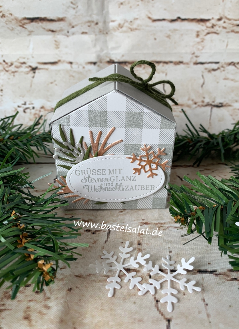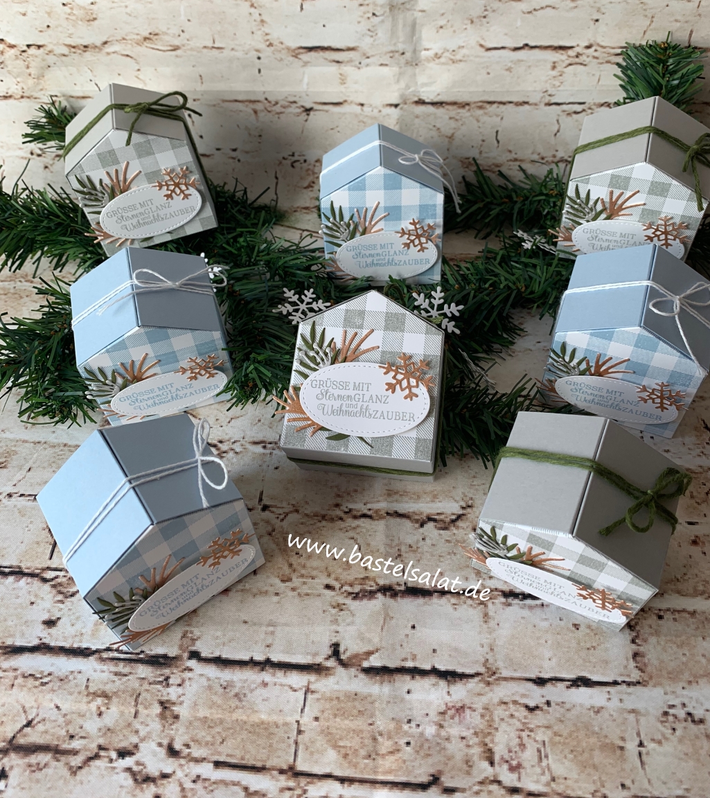 Ich habe mich für eine Verpackung – wie sollte es bei mir auch anders sein 😅 – entschieden und ein paar kleine, weihnachtliche Häuschen gezaubert.
