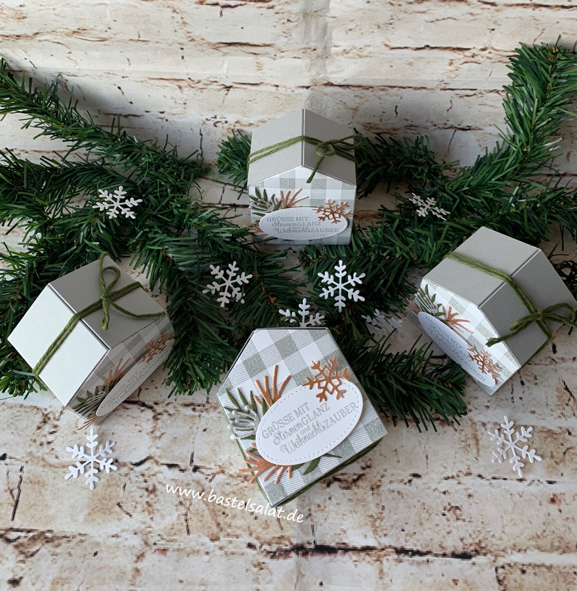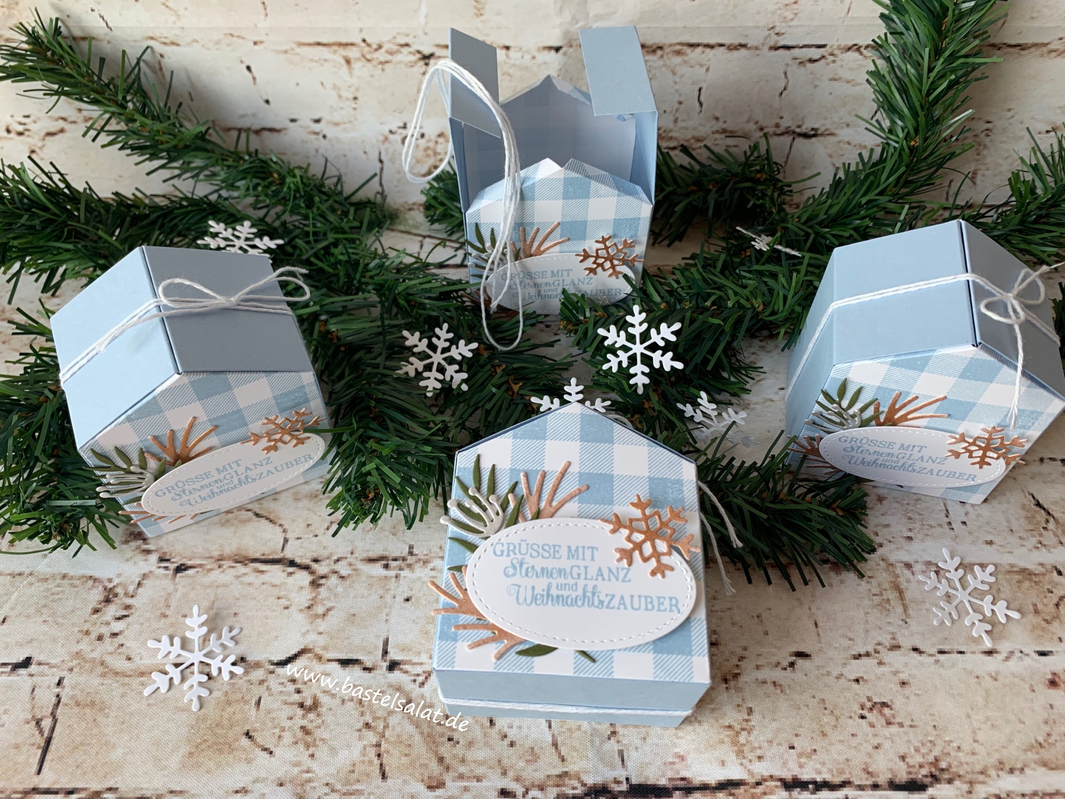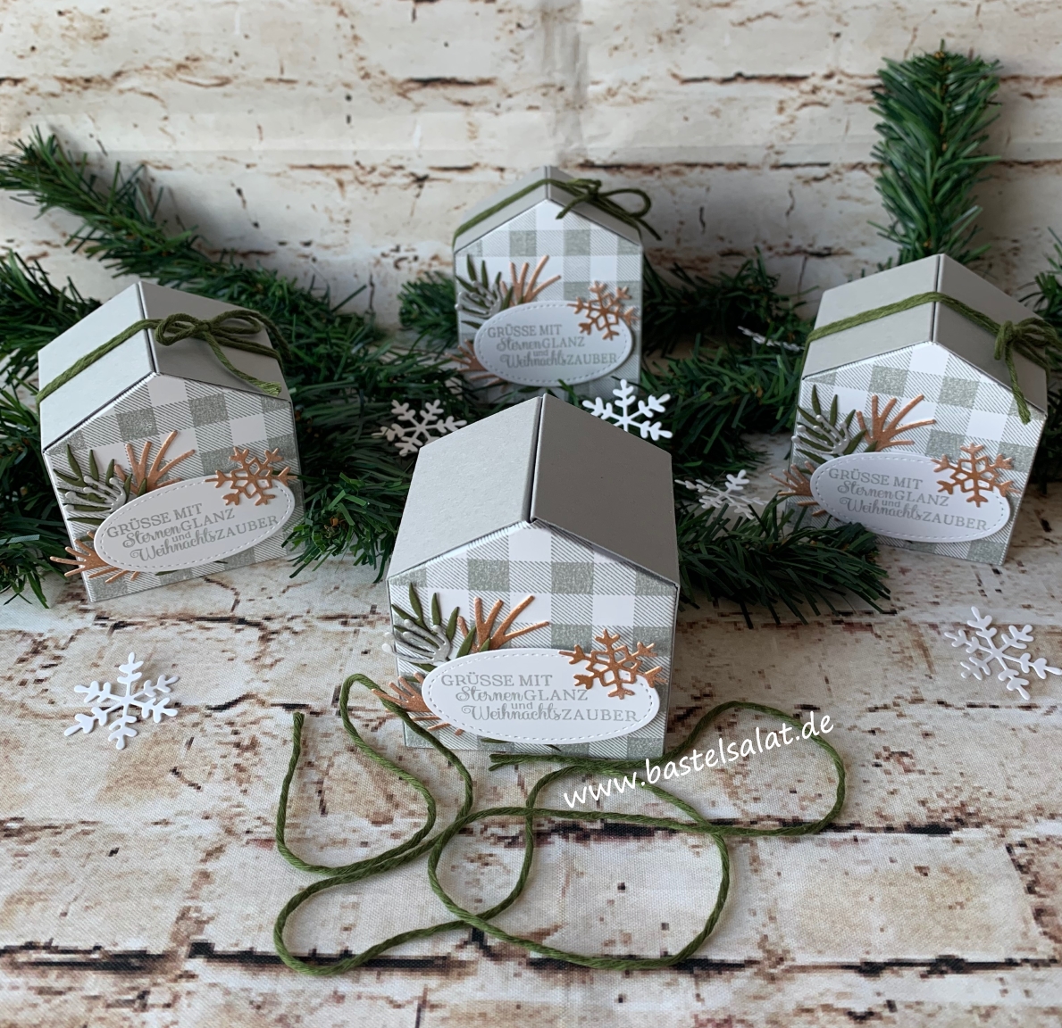 Ich habe mich für eine Verpackung – wie sollte es bei mir auch anders sein 😅 – entschieden und ein paar kleine, weihnachtliche Häuschen gezaubert.