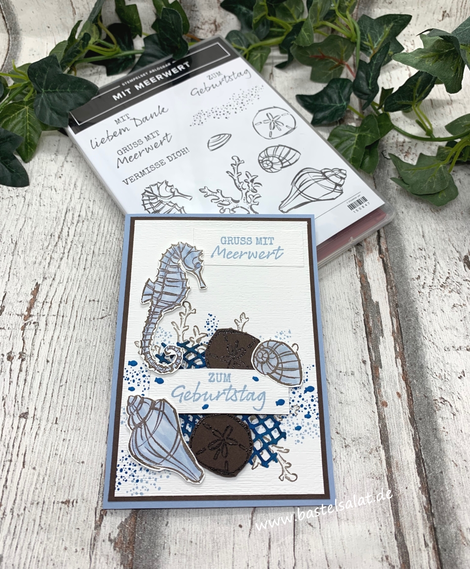 Für mein Projekt habe ich mir das schöne, neue Stempelset „Mit Meerwert“ geschnappt und damit diese maritime Geburtstagskarte gezaubert.
