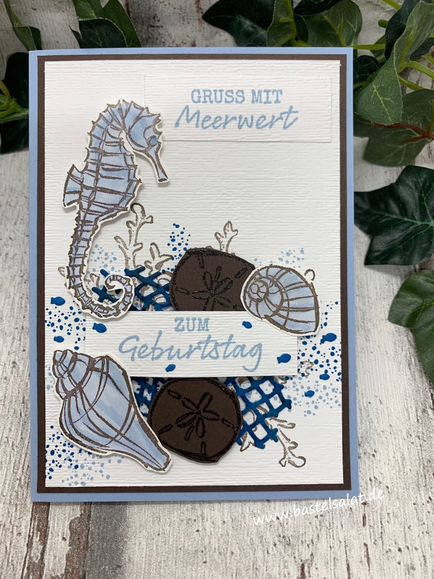 Das Seepferdchen und die Muscheln sind in der Farbe Espresso auf Flüsterweiß gestempelt und mit Stampin‘ Blends in Rauchblau coloriert. Das andere Motiv – für mich sieht es ein bisschen aus wie ein Seestern, aber ob das korrekt ist… 😅 – habe ich in der Farbe Espresso auf Espresso gestempelt und anschließend Klar embosst.