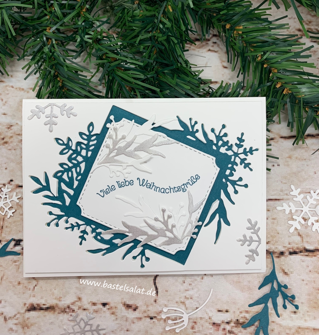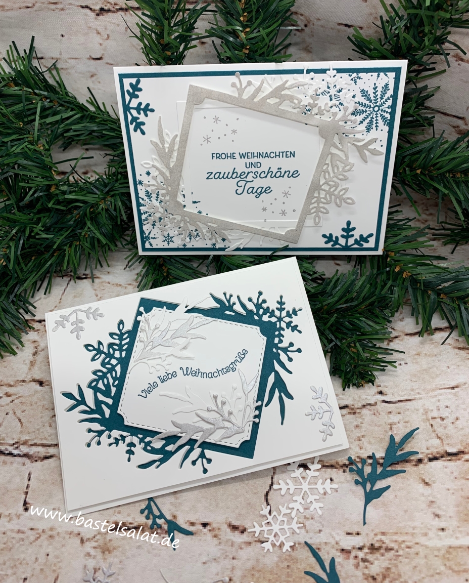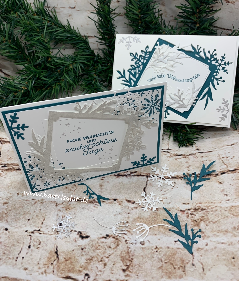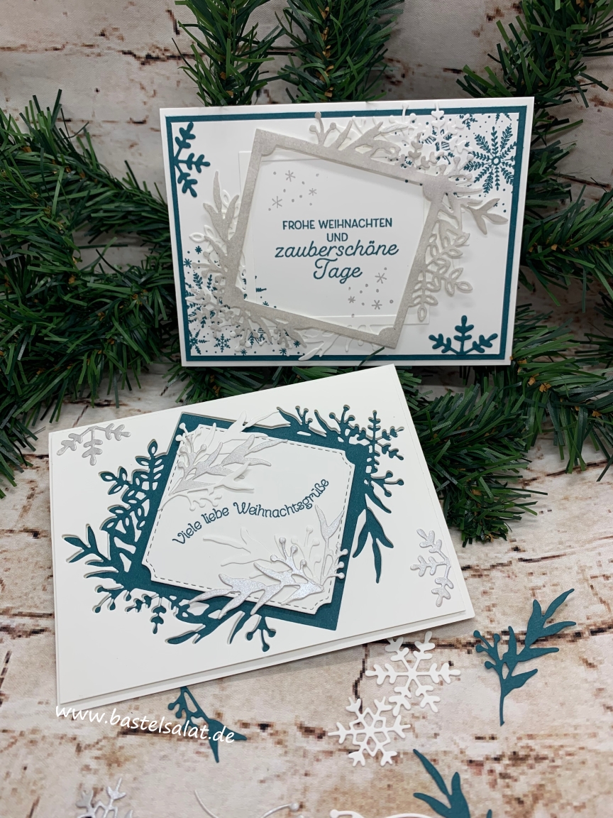 Ich habe mal nicht auf die typischen Weihnachtsfarben zurückgegriffen sondern bei beiden Karten mit Flüsterweiß und Pfauengrün gearbeitet.