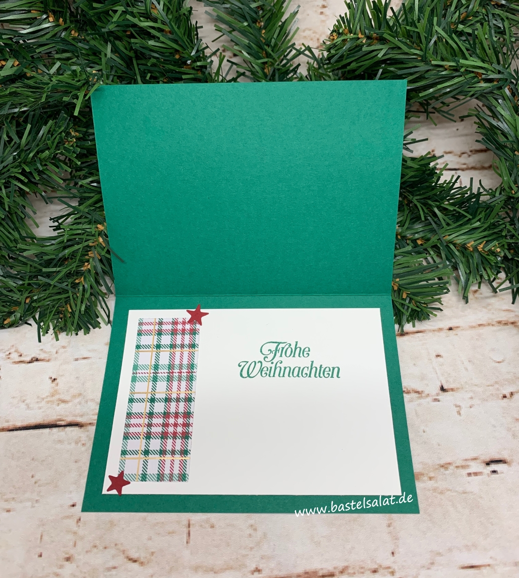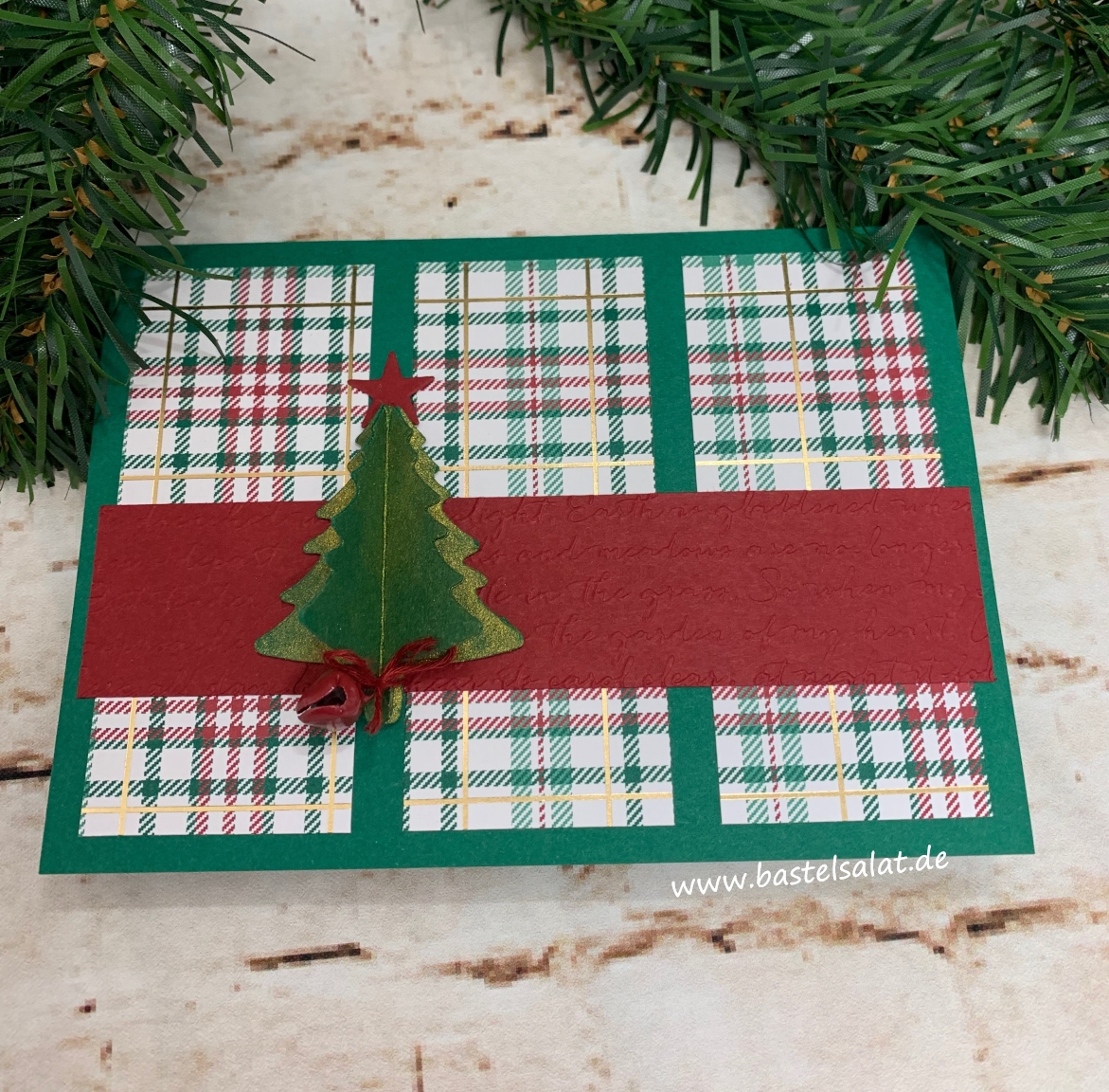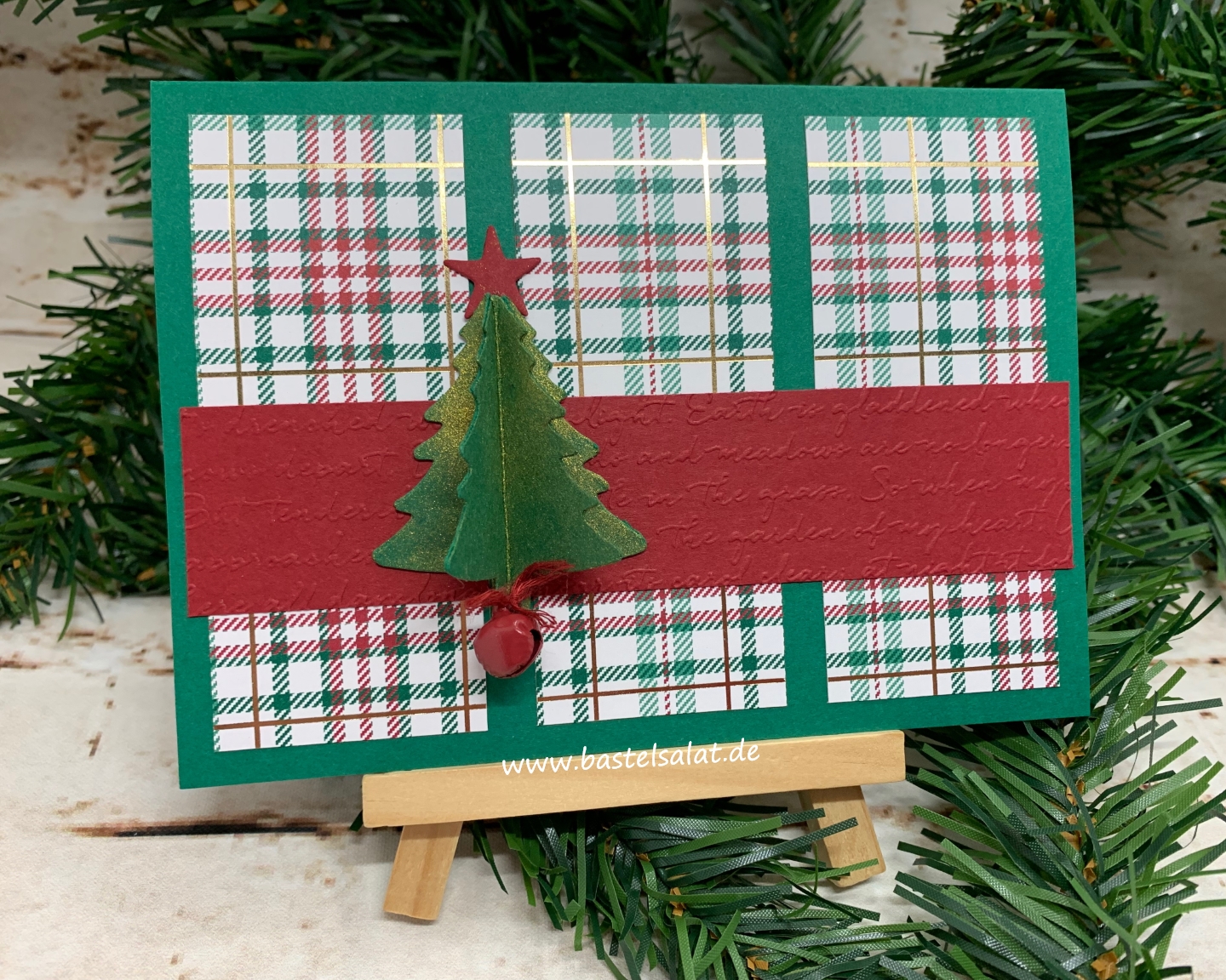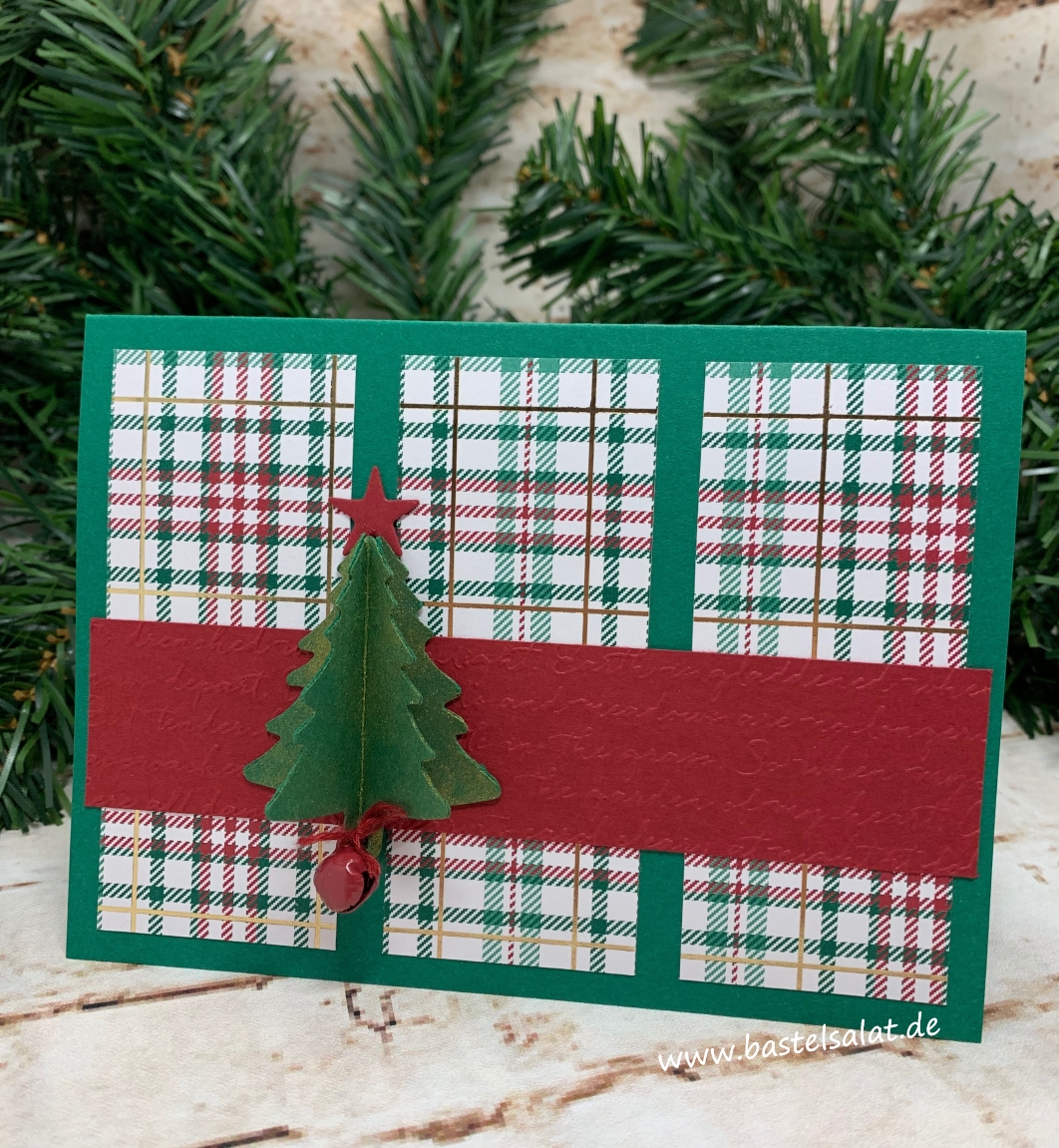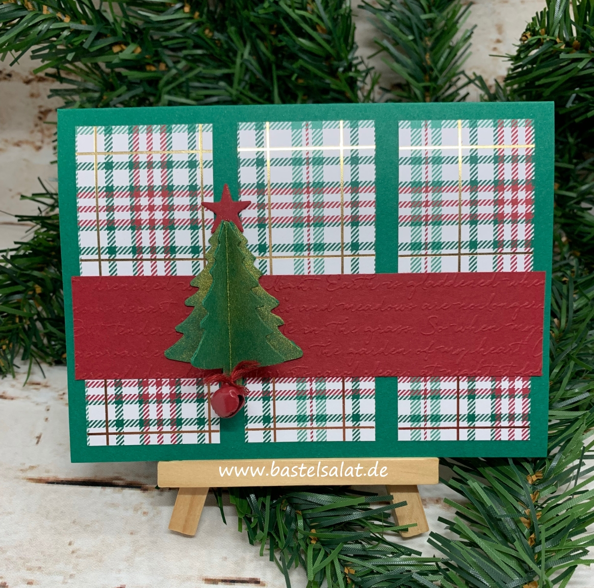 Da der abgebildete Stern nicht zwingend ein Stern sein musste, sondern einfach was besonderes sein sollte, habe ich mir das schöne Produktpaket Tannen & Karos – bestehend aus der Stanze Nadelbaum und dem Stempelset Tannen & Karos – geschnappt und damit eine Weihnachtskarte gezaubert.