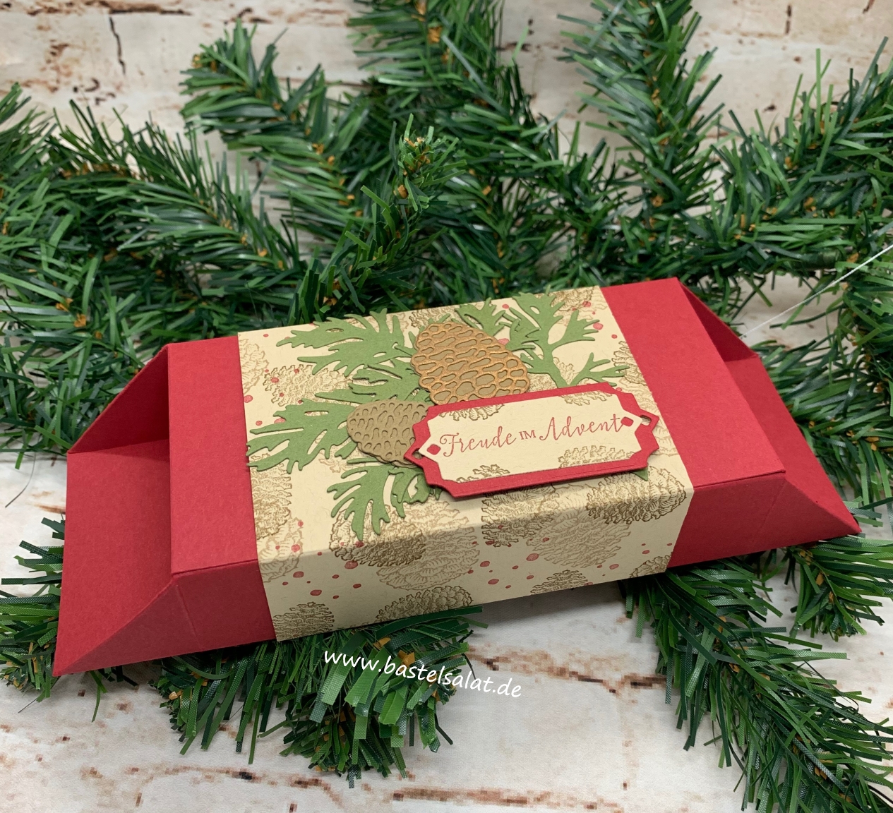 Bei dieser Verpackung habe ich mal auf ein paar klassische Weihnachtsfarben zurückgegriffen. Die Box ist aus Glutrotem Farbkarton und bei der Dekoration kam dann noch Farbkarton in Waldmoos, Wildleder und Savanne zum Einsatz.