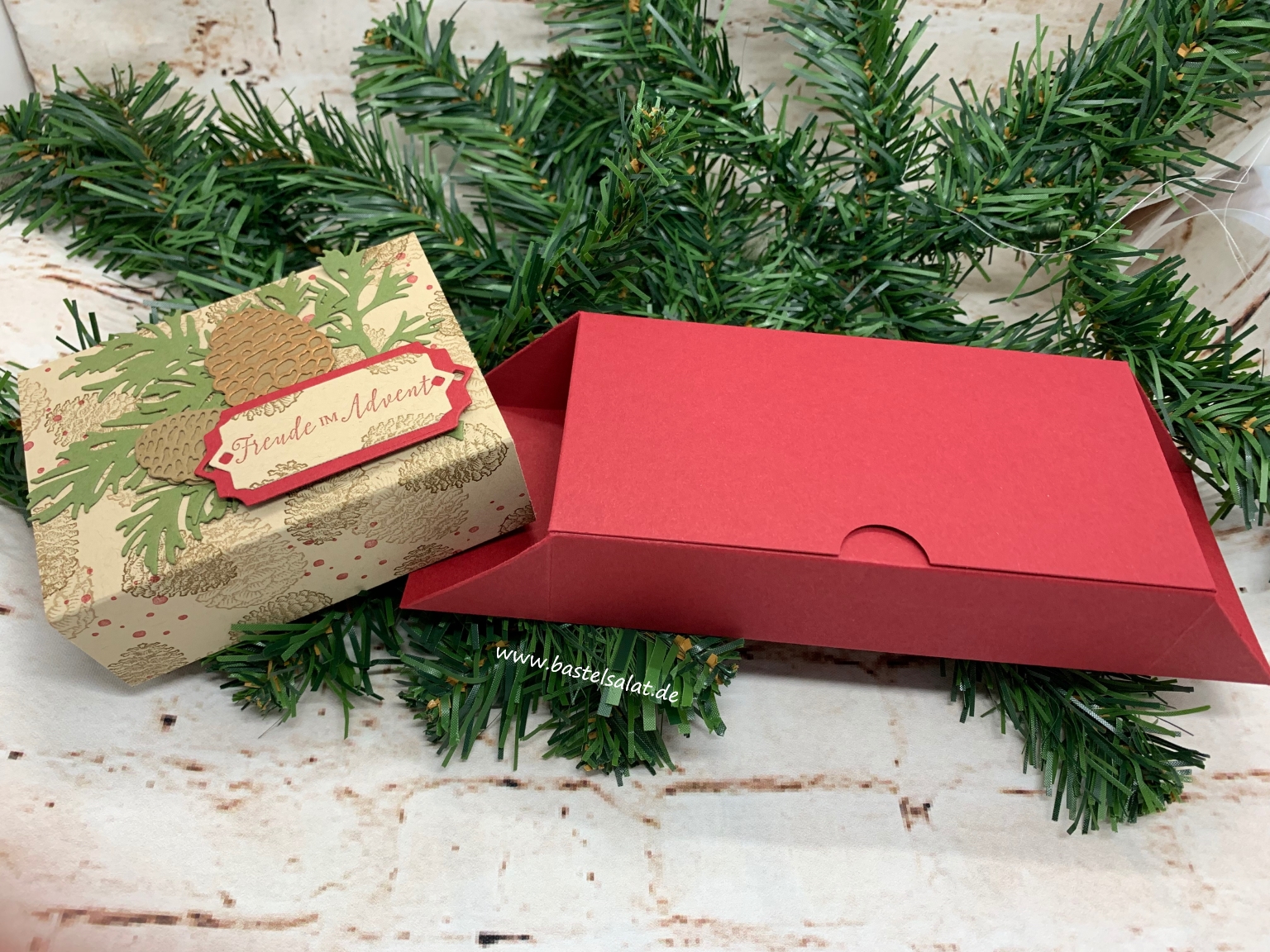 Bei dieser Verpackung habe ich mal auf ein paar klassische Weihnachtsfarben zurückgegriffen. Die Box ist aus Glutrotem Farbkarton und bei der Dekoration kam dann noch Farbkarton in Waldmoos, Wildleder und Savanne zum Einsatz.