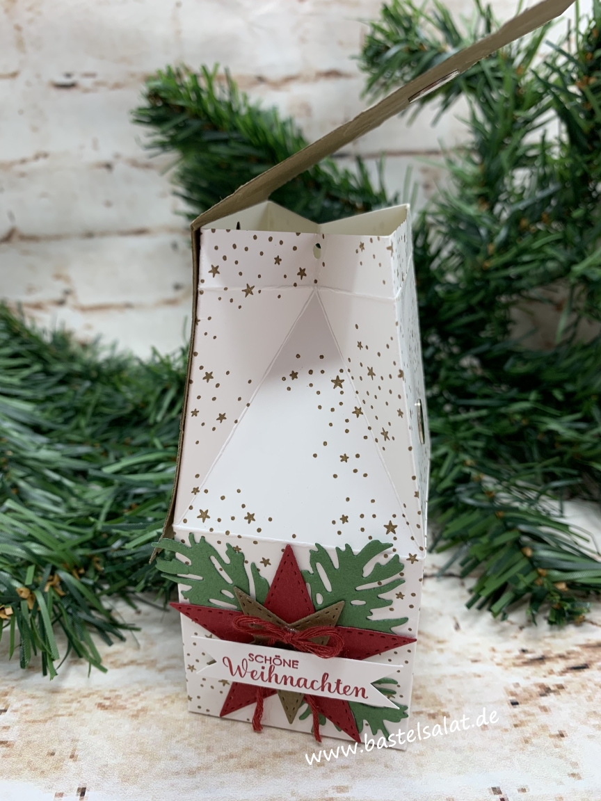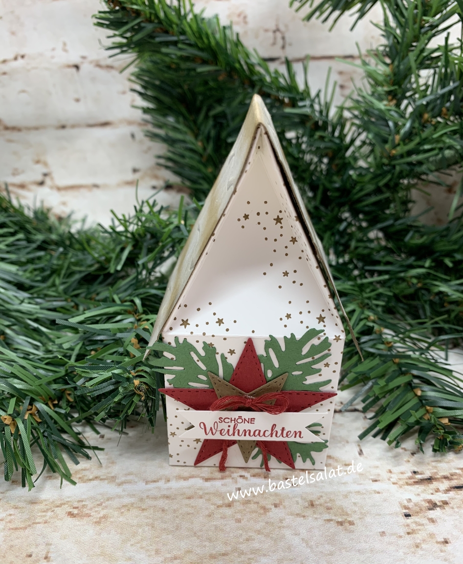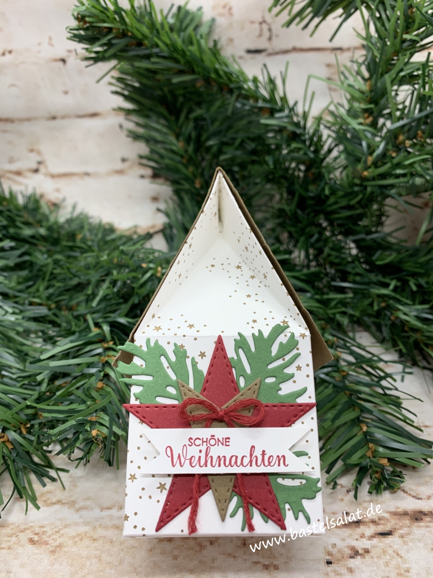 Der Flüsterweiße Farbkarton ist mit einem Stempel aus dem Set Sternenglanz in Wildleder bestempelt. Beim dekorieren/verzieren des kleinen Milchkartons, welcher sich nur durch aufsetzen eines Daches ganz fix in ein kleines Häuschen verwandelt, habe ich Farbkarton in Chili, Waldmoos und Wildleder,