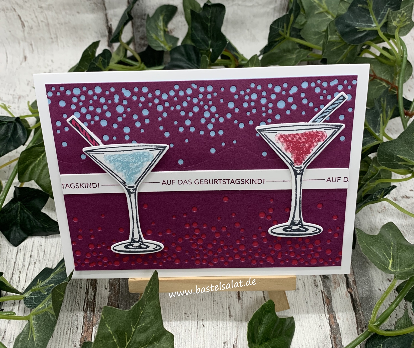 Bei den Stanzformen zum Wohl ist auch eine für so kleine Blubberbläschen dabei. Damit habe ich den Himbeerroten Farbkarton bearbeitet und ihn dann an den ausgestanzten Flächen mit Farbkarton in Babyblau und Kussrot hinterlegt.