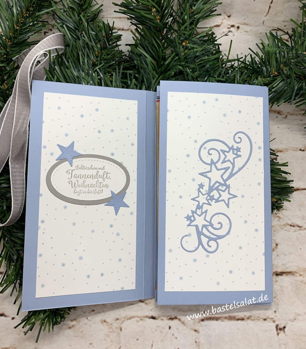 Auch das Stempelset Das schönste zum Fest, die Stanzformen Bestickte Sterne und die Stanze Nadelbaum kamen zum Einsatz.