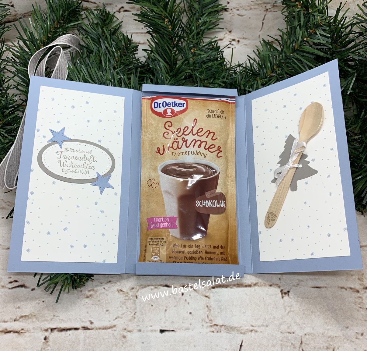 Zu diesem Thema habe ich eine winter-/weihnachtliche Verpackung für einen Tassenpudding – den leckeren Seelenwärmer – gezaubert.