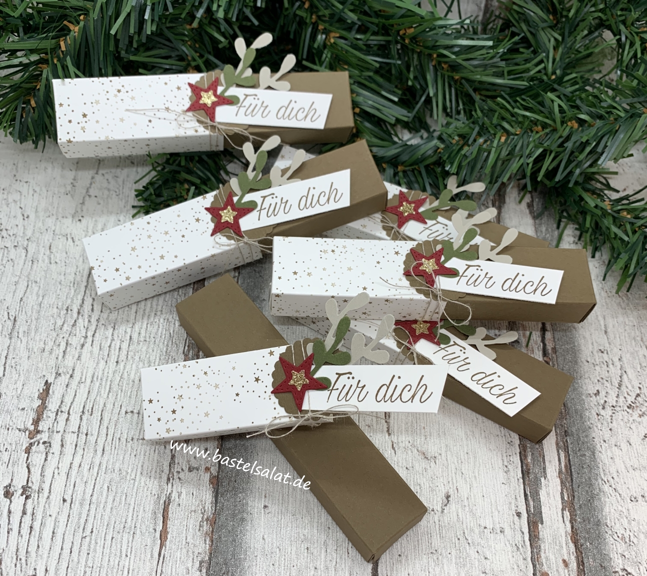 Aus Farbkarton in Wildleder und selbstgemachtem Designer Papier habe ich eine kleine, weihnachtliche Verpackung für die „Längste Praline der We….“ (die natürlich auch darin versteckt war) gezaubert.