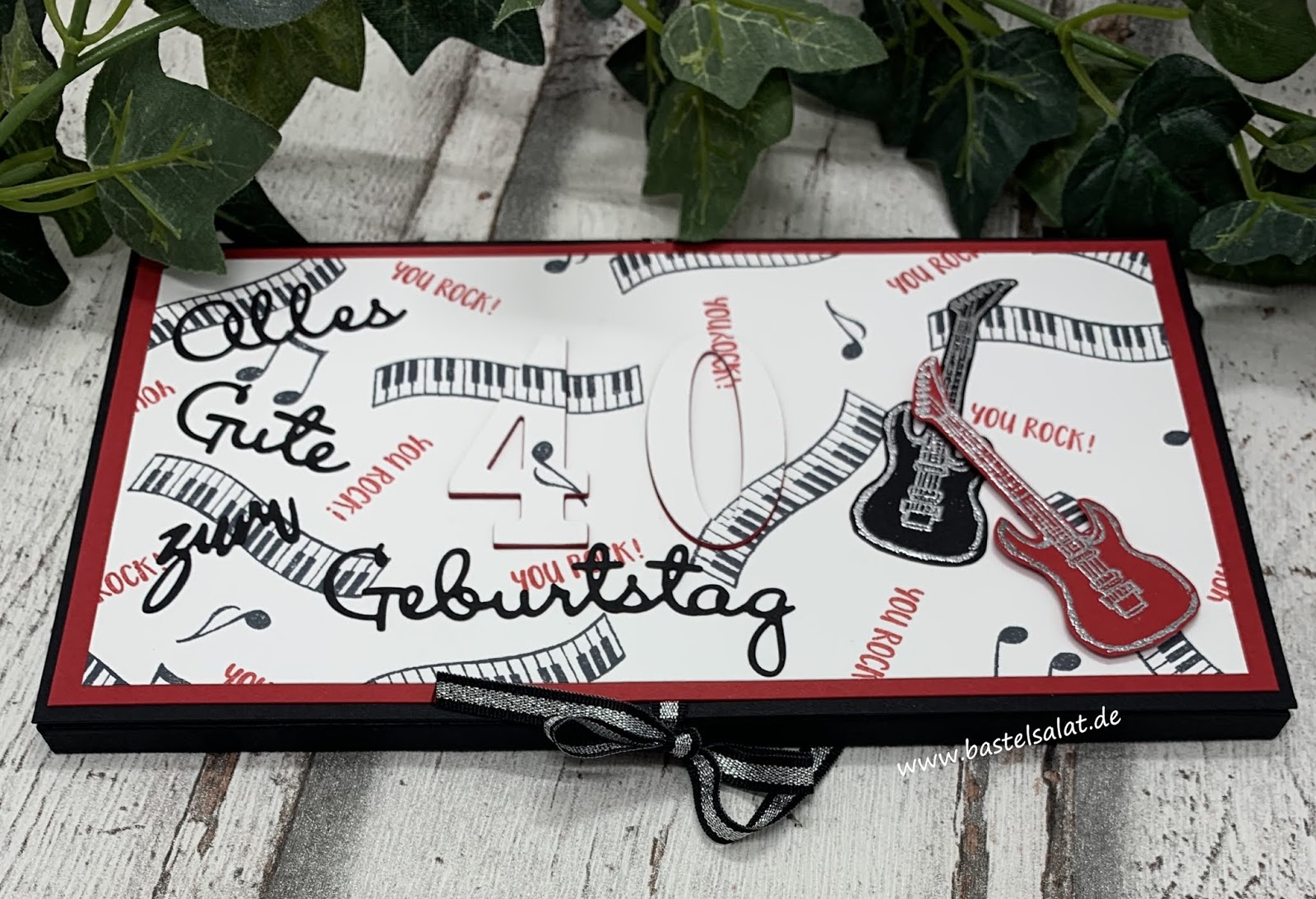 Den Farben der Konzertkarte angepasst – mein Auftraggeber hatte mir ein Bild davon gesendet – habe ich bei der Verpackung mit Schwarz, Glutrot und Flüsterweiß gespielt.