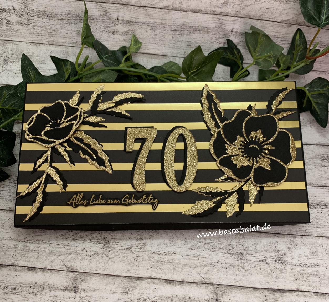 Die Grundverpackung ist aus schwarzem Farbkarton entstanden. Zum dekoriert/verzieren habe ich das wunderschönen Designerpapier Bienengold (SAB Produkt) verwendet und mit den Stanzformen Mohnblüten gearbeitet.