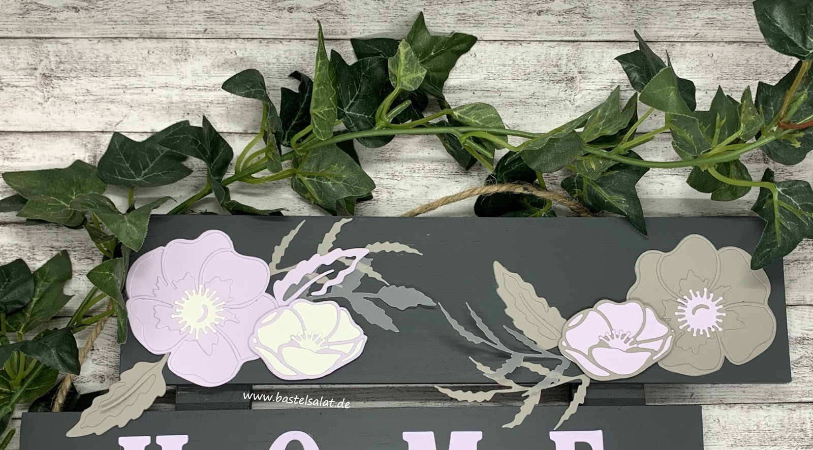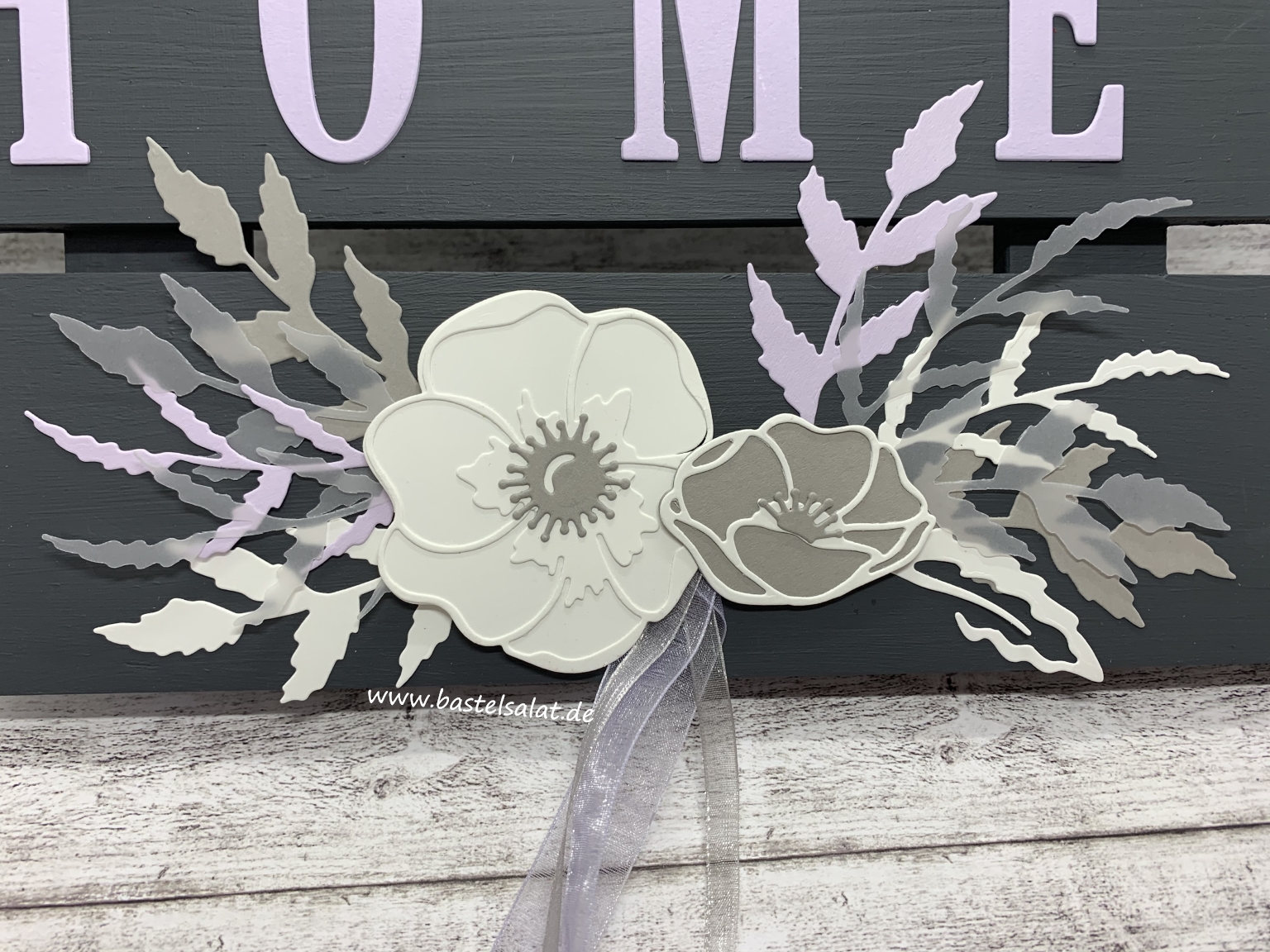 Die tollen Blüten und Blätter sind mit den neuen Stanzformen „Mohnblüten“ aus dem Minikatalog Januar-Juni 2020 ausgestanzt. Bei den Buchstaben habe ich auf die alten Framelits Große Buchstaben, die es leider nicht mehr gibt, zurückgegriffen.