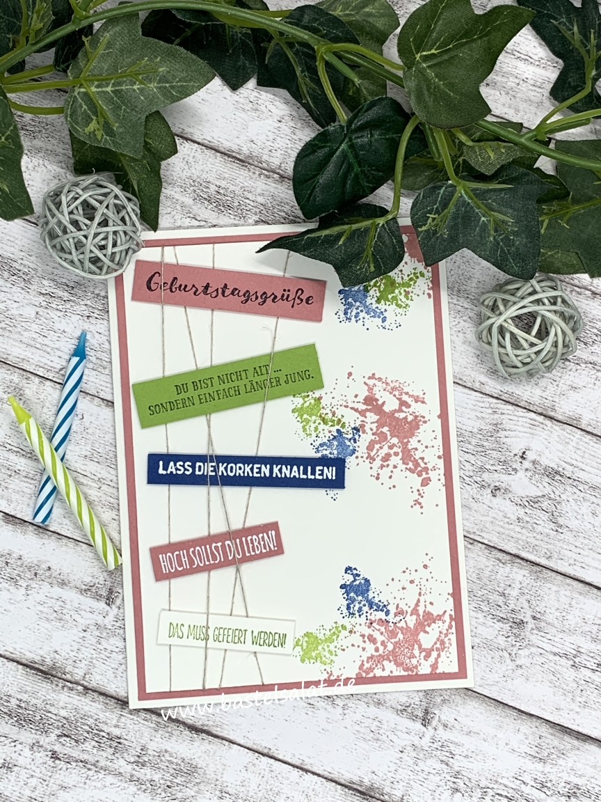 Diese Art von Karte ist richtig fix gemacht. Einfach verschiedene Glückwünsche, Sprüche auf Farbkartonstreifen stempeln, nach Lust und Laune auf der Karte anbringen … fertig.