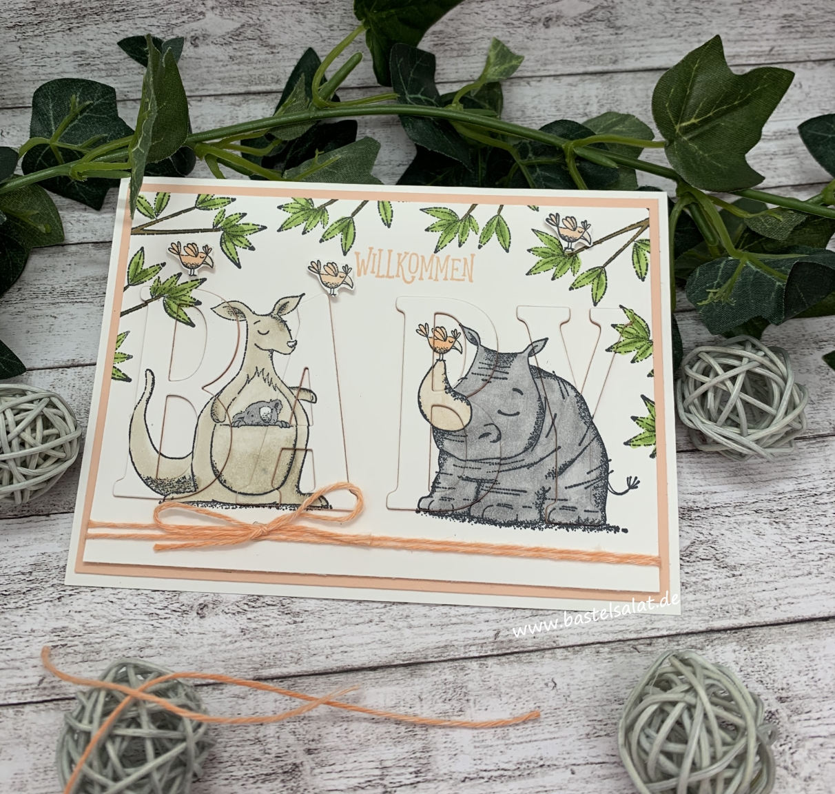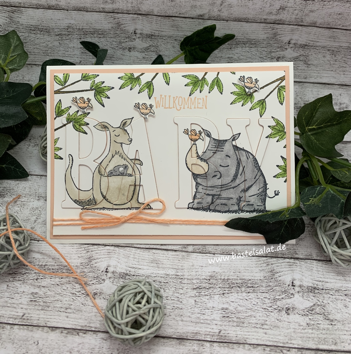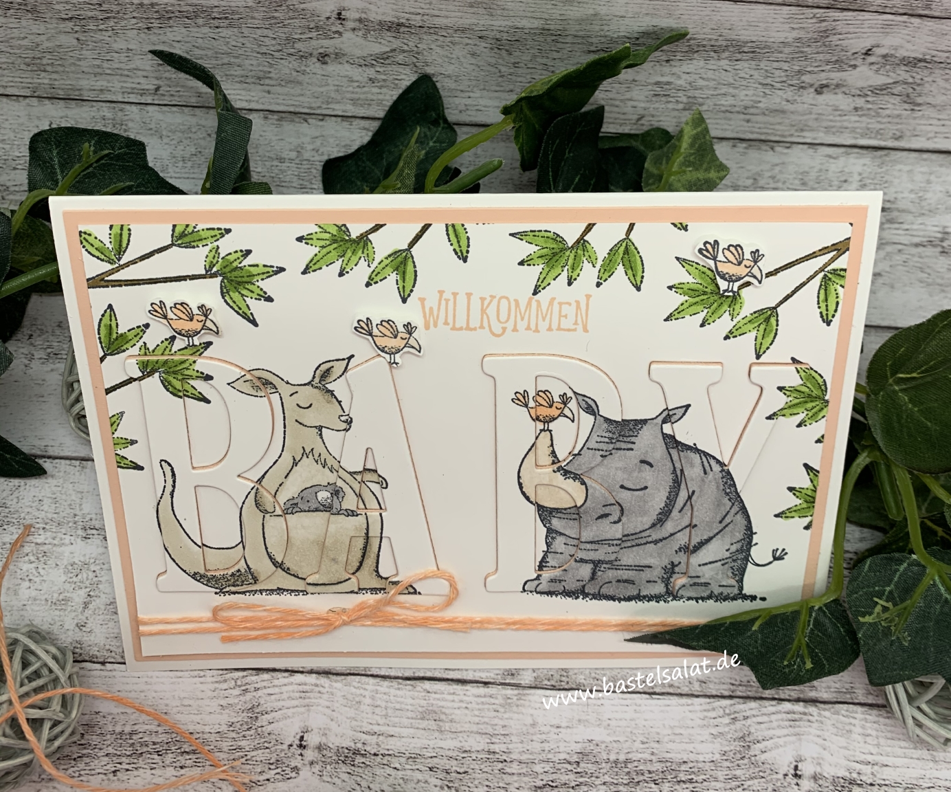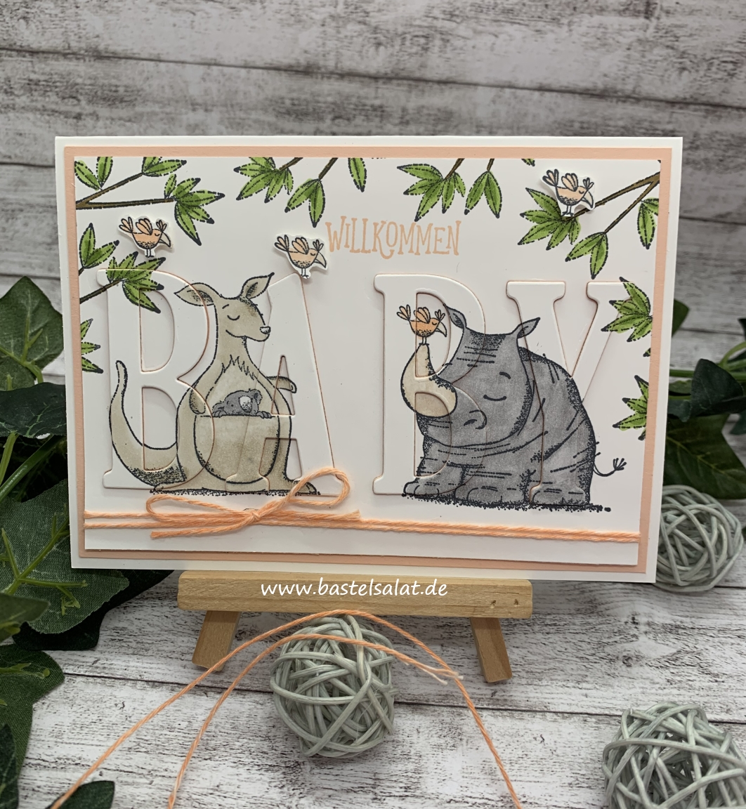 Bei dieser Karte habe ich die Floating Letters Technik angewendet. Dabei bestempelt man zuerst den Aufleger mit seinen gewünschten Motiven – ich habe das Stempelset Wild auf Grüße verwendet -, coloriert diese ggf. im Anschluss und stanzt dann dort die gewünschten Buchstaben/das gewünschte Wort heraus.