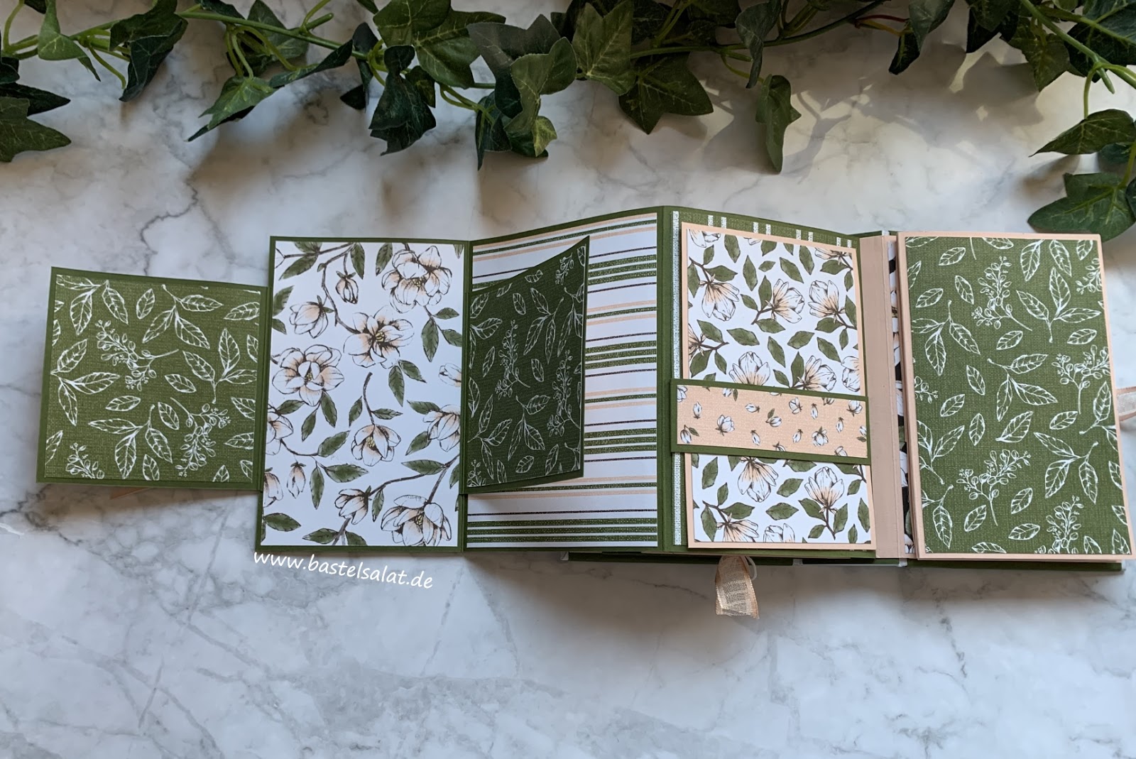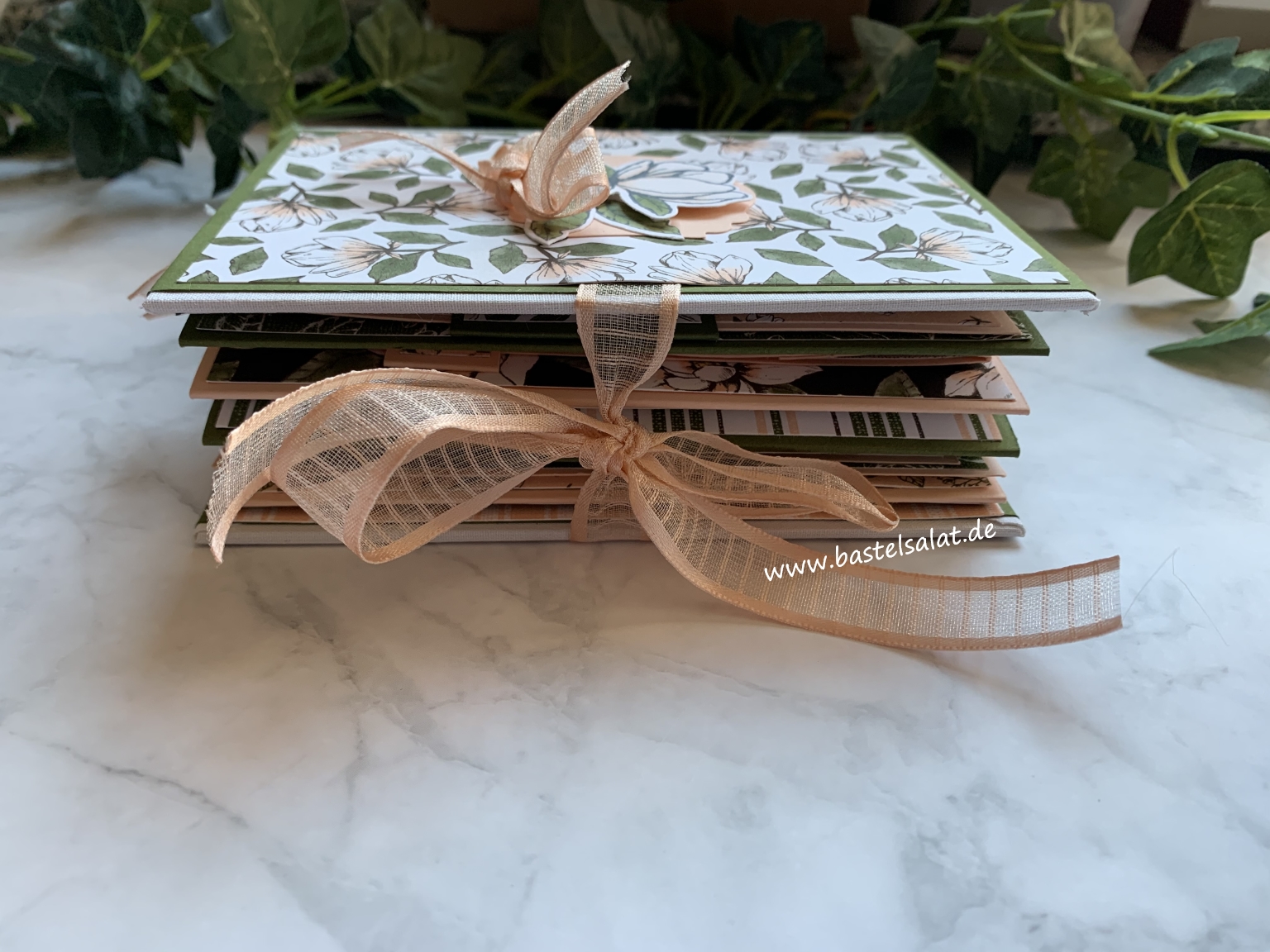 Diesmal habe ich das Album, welches 15 cm x 10.5 cm groß ist, aus dem schönen Designerpapier Magnolienweg gezaubert. Damit der Buchdeckel und Buchrücken auch schön stabil ist habe ich hier auch wieder als Basis Graupappe verwendet.