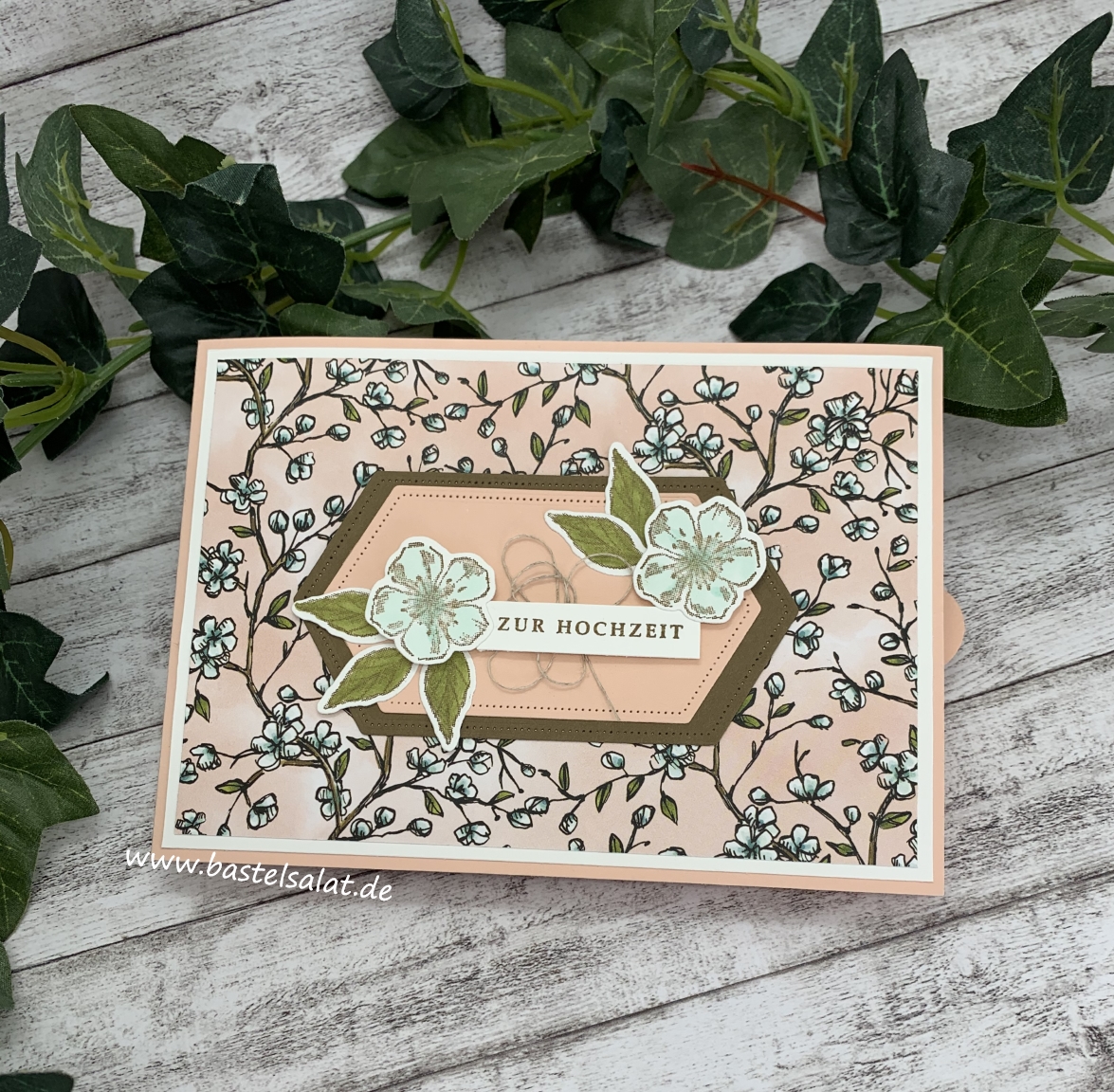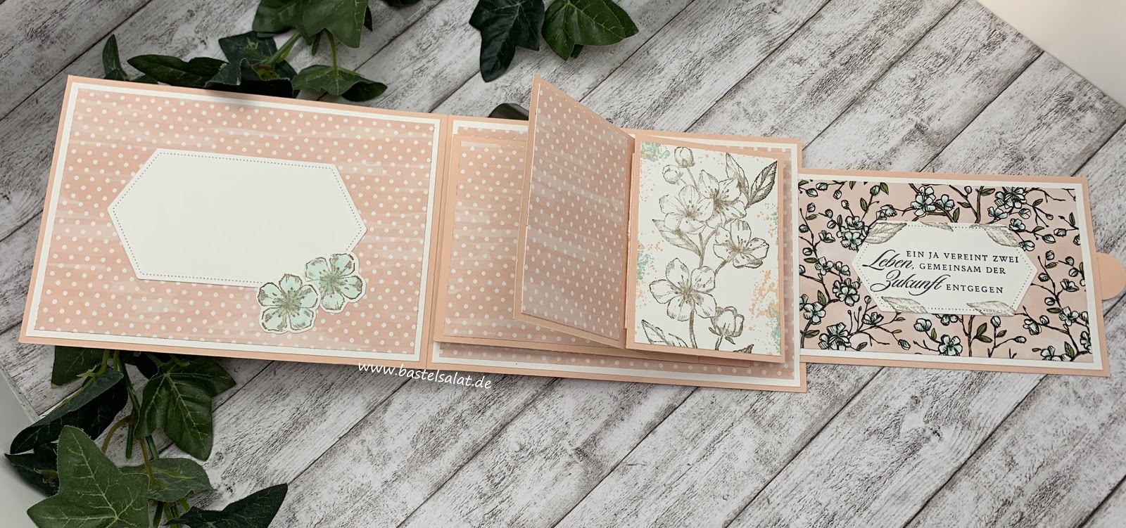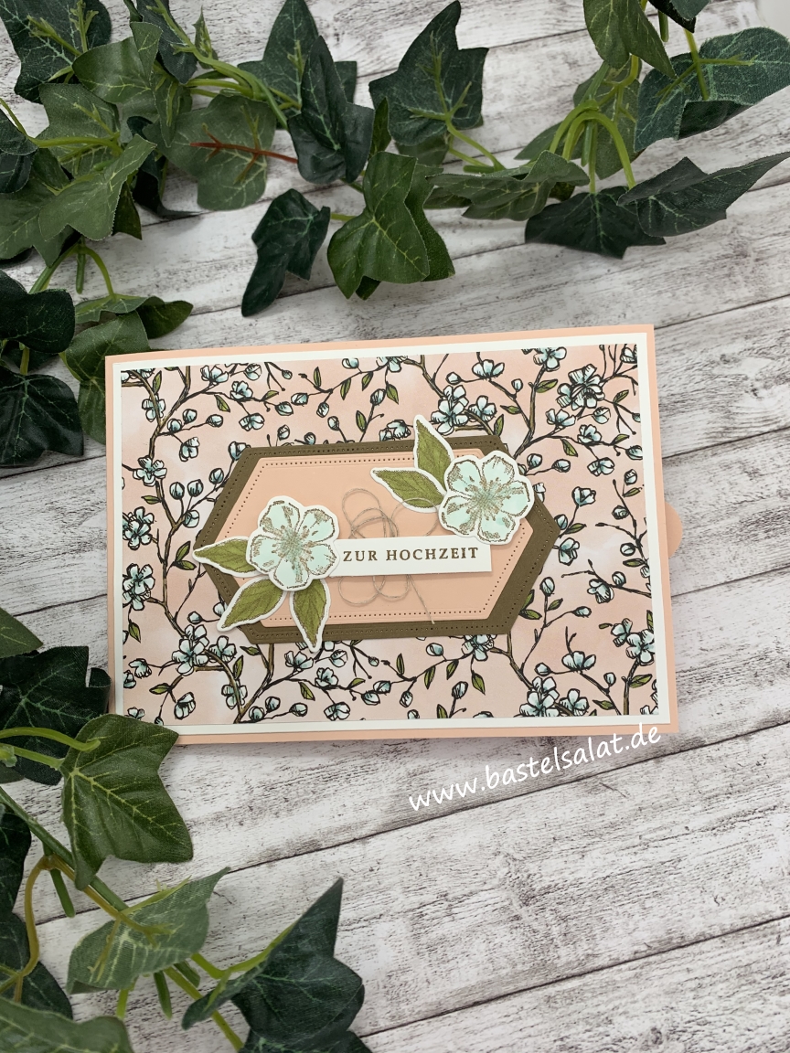 Diesmal habe ich mit Farbkarton in Blütenrosa, Wildleder und Flüsterweiß, sowie dem schönen Designerpapier Vogelgarten gearbeitet und die Karte als Hochzeitskarte gestaltet.