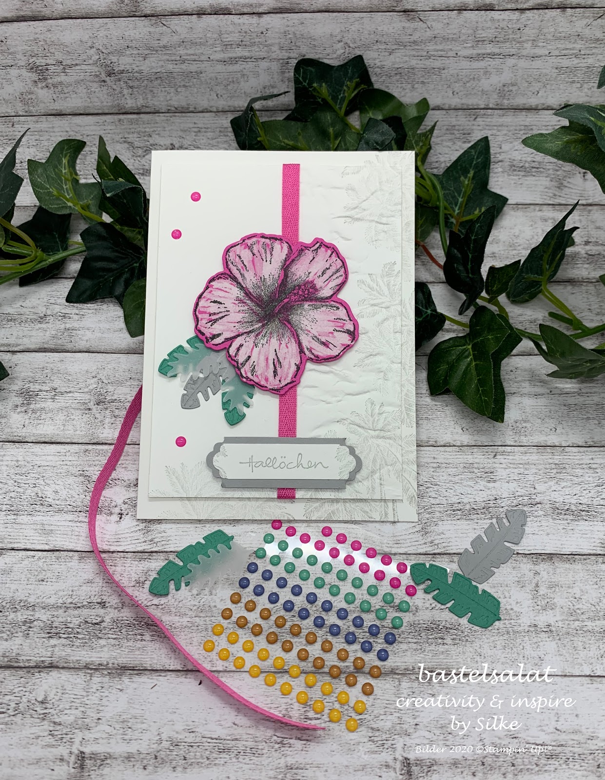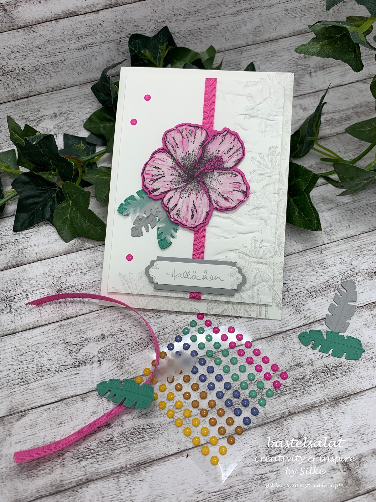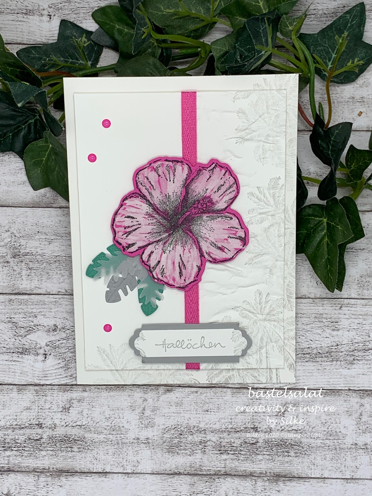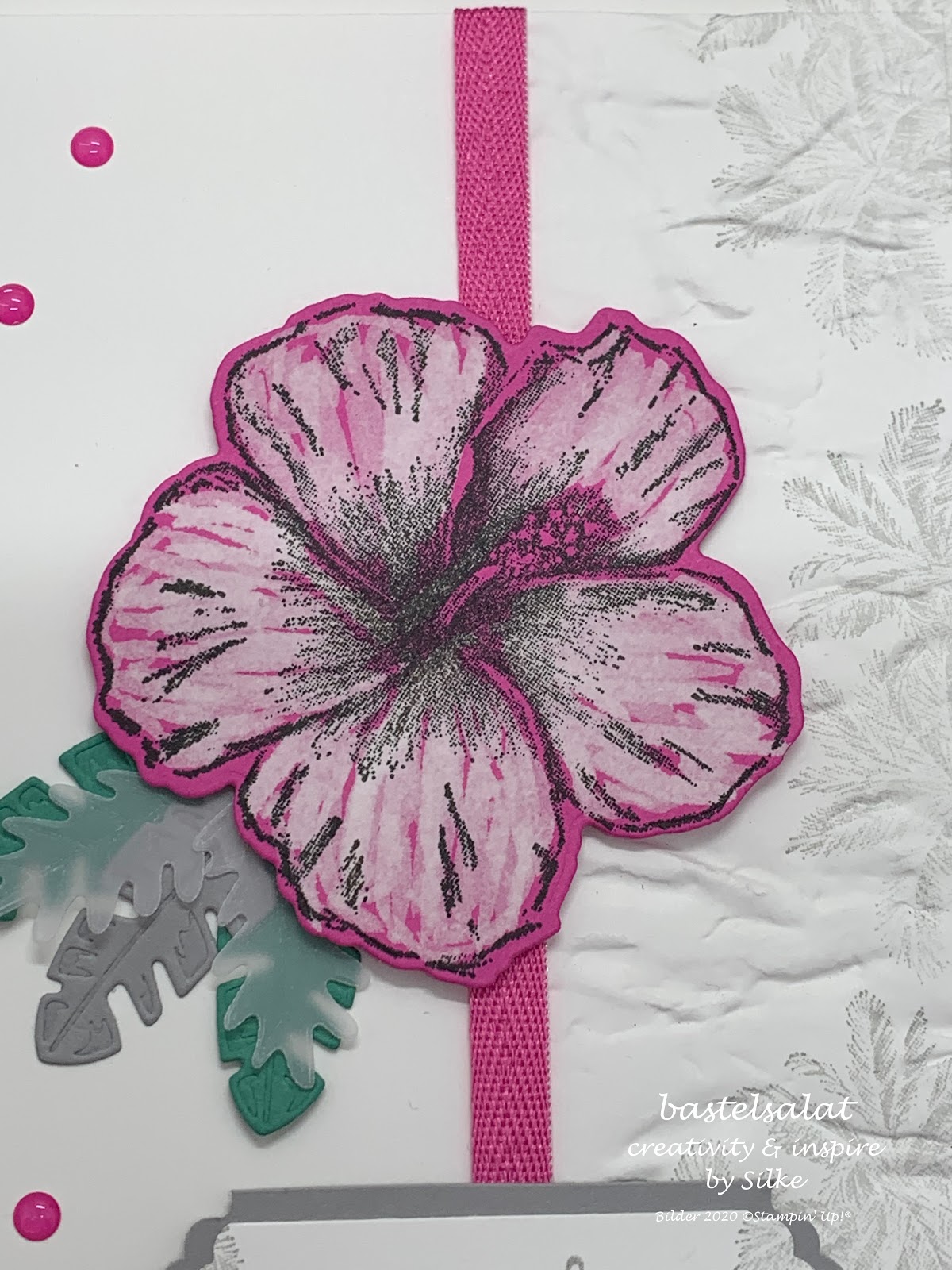 Die Technik kam hier bei der mit StãzOn auf dem Magentarotfarbenden Farbkarton gestempelten Blüte aus dem Set „Tropische Träume“ (dieses Set bleibt uns zum Glück aus dem Frühjahr-/Sommerkatalog erhalten) zum Einsatz.