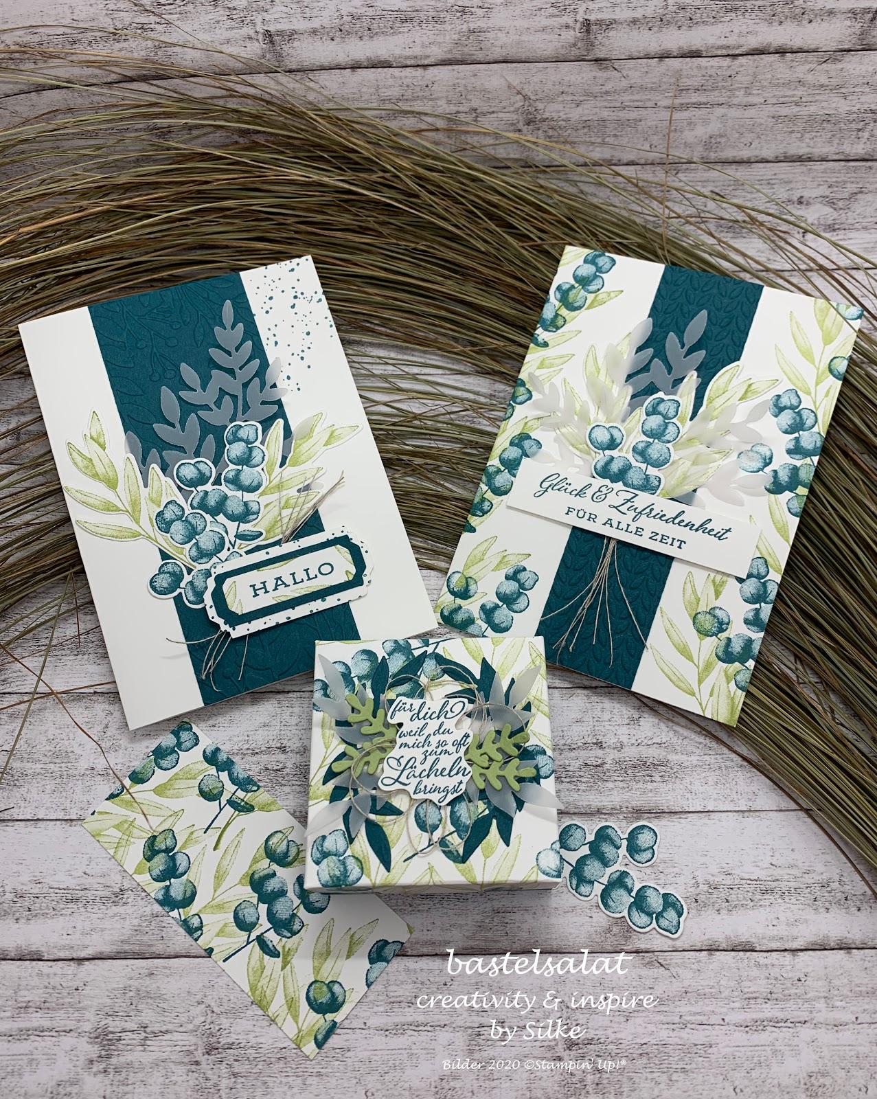 Bei allen 3 Projekten habe ich Flüsterweiß mit Pfauengrün, Farngrün und ein wenig Pergament kombiniert.