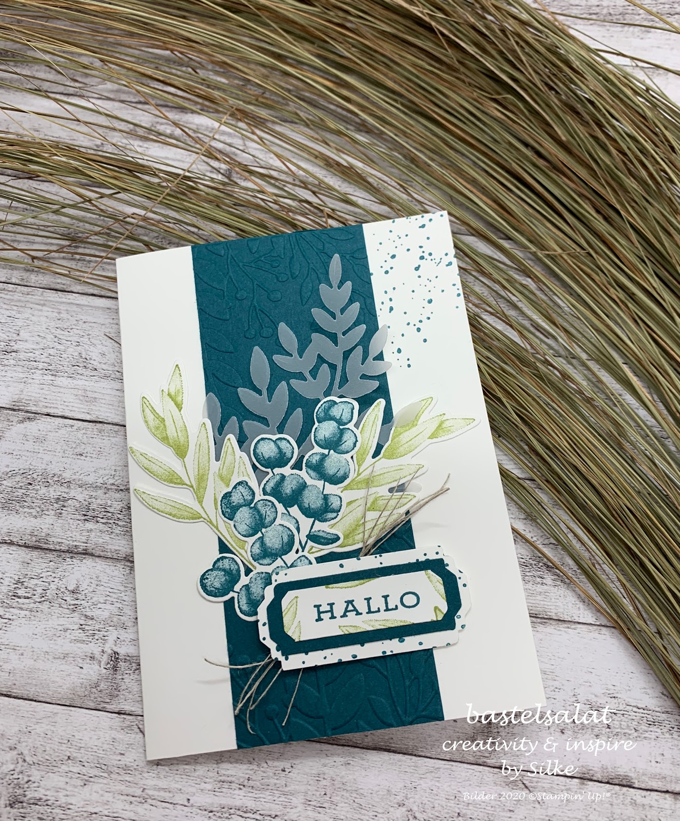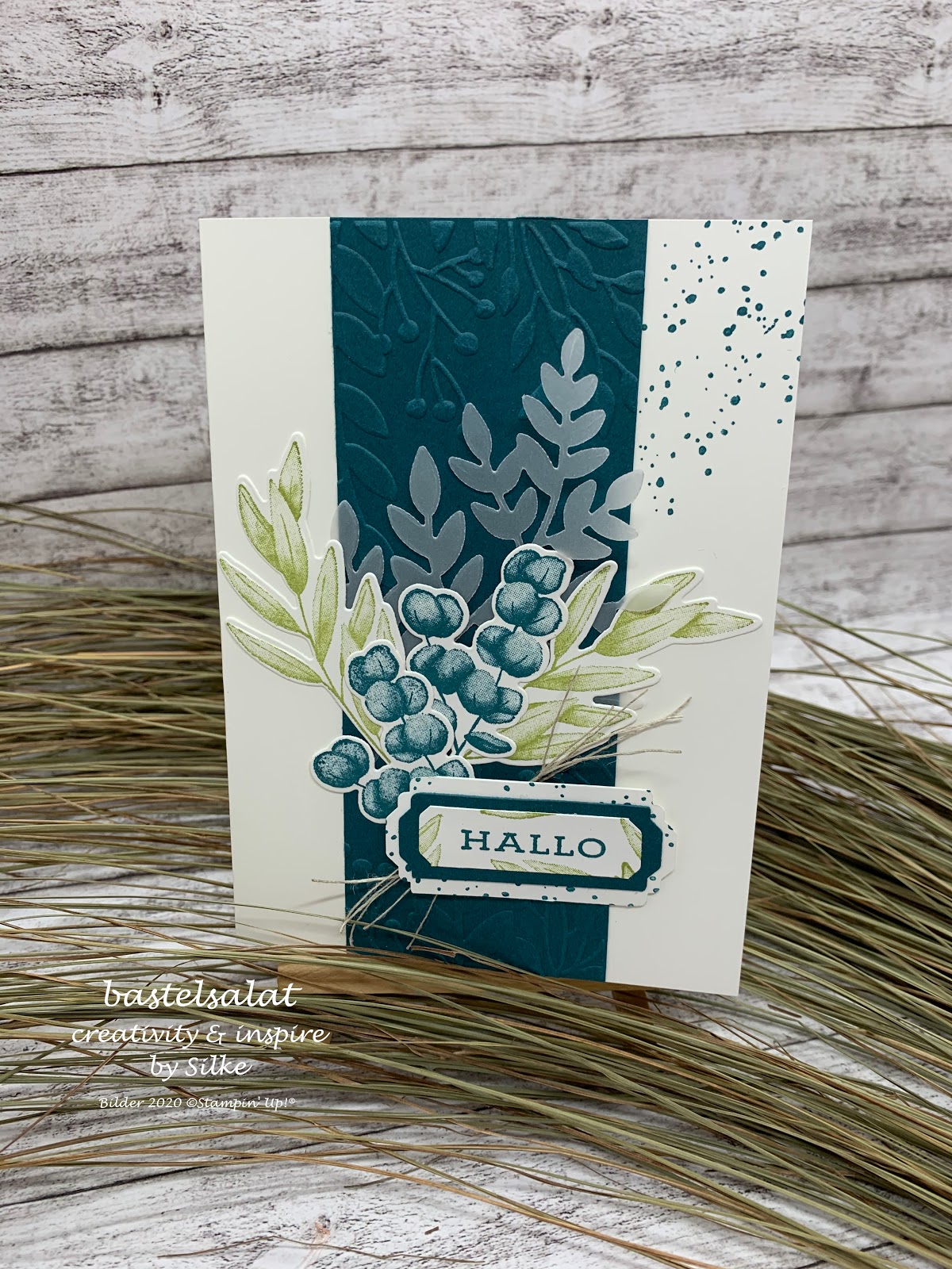 Zum guten Schluss ist die Entscheidung dann auf die Produktreihe „Ewiges Grün“ gefallen. Daraus habe ich mir das Stempelset „Für alle Zeit“ mit den dazugehörigen Stanzformen „Ewige Zweige“ sowie die Prägeform „Blattgrün“ geschnappt