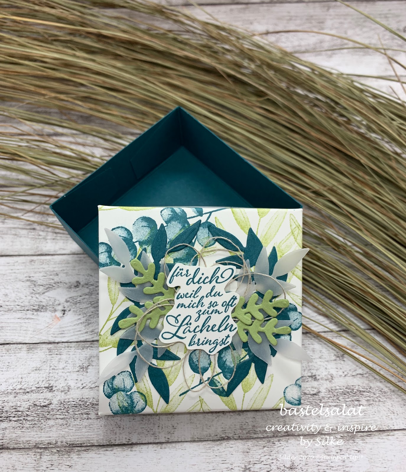 habe ich bei der Verpackungsbox mir das Designerpapier für den Deckel einfach schnell mit dem Stempelset und den Stempelfarben Farngrün und Pfauenblau selber gemacht.