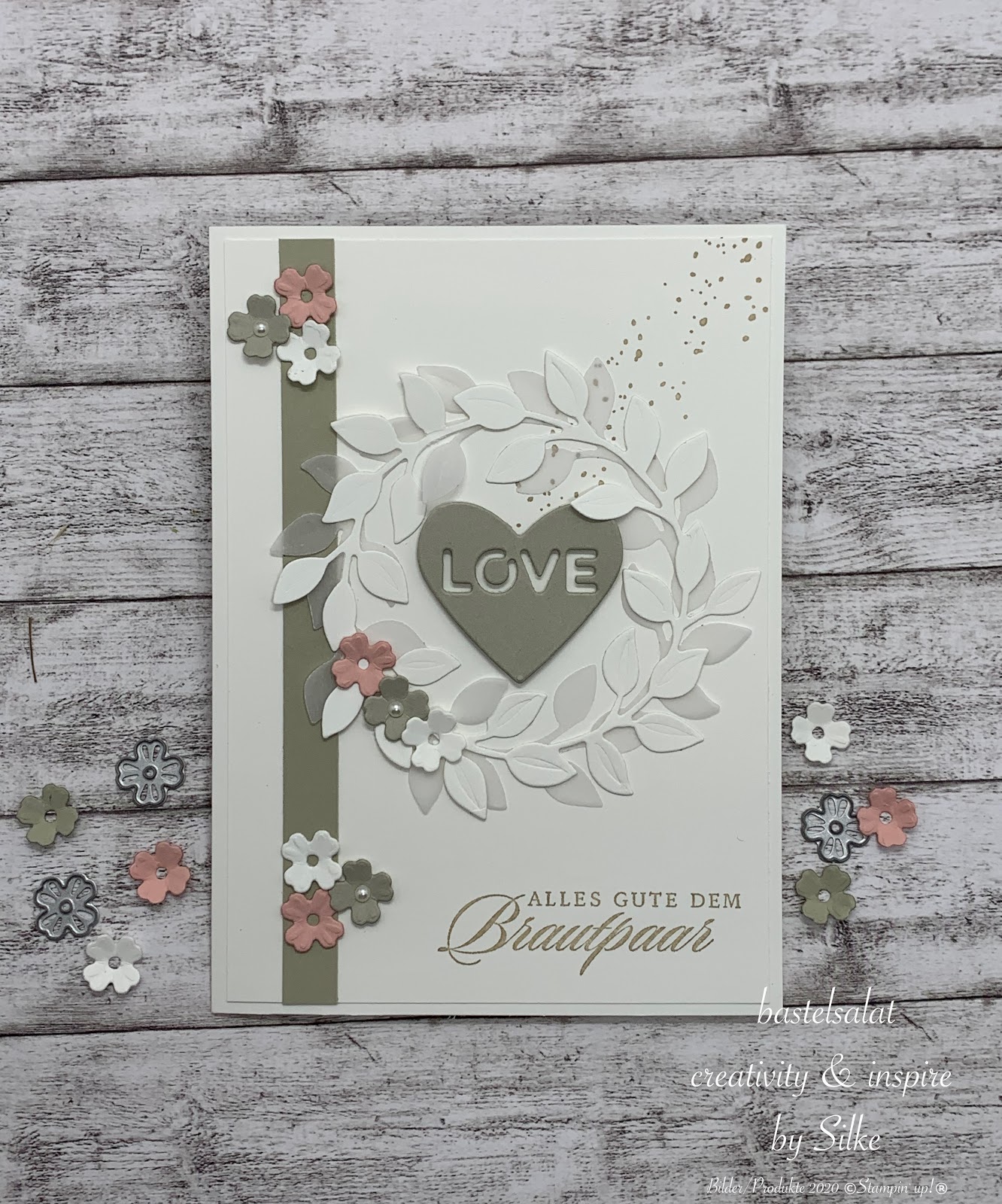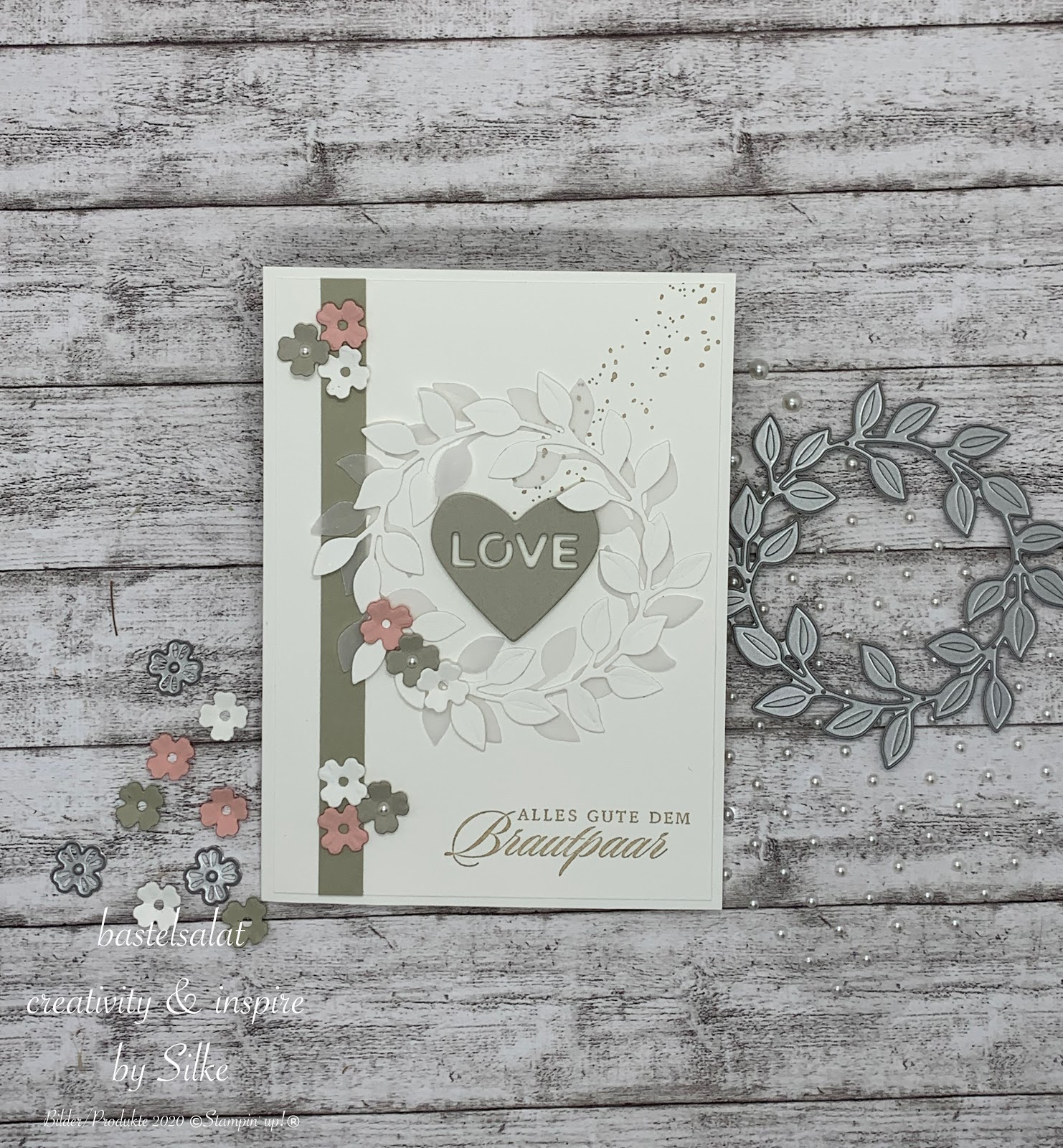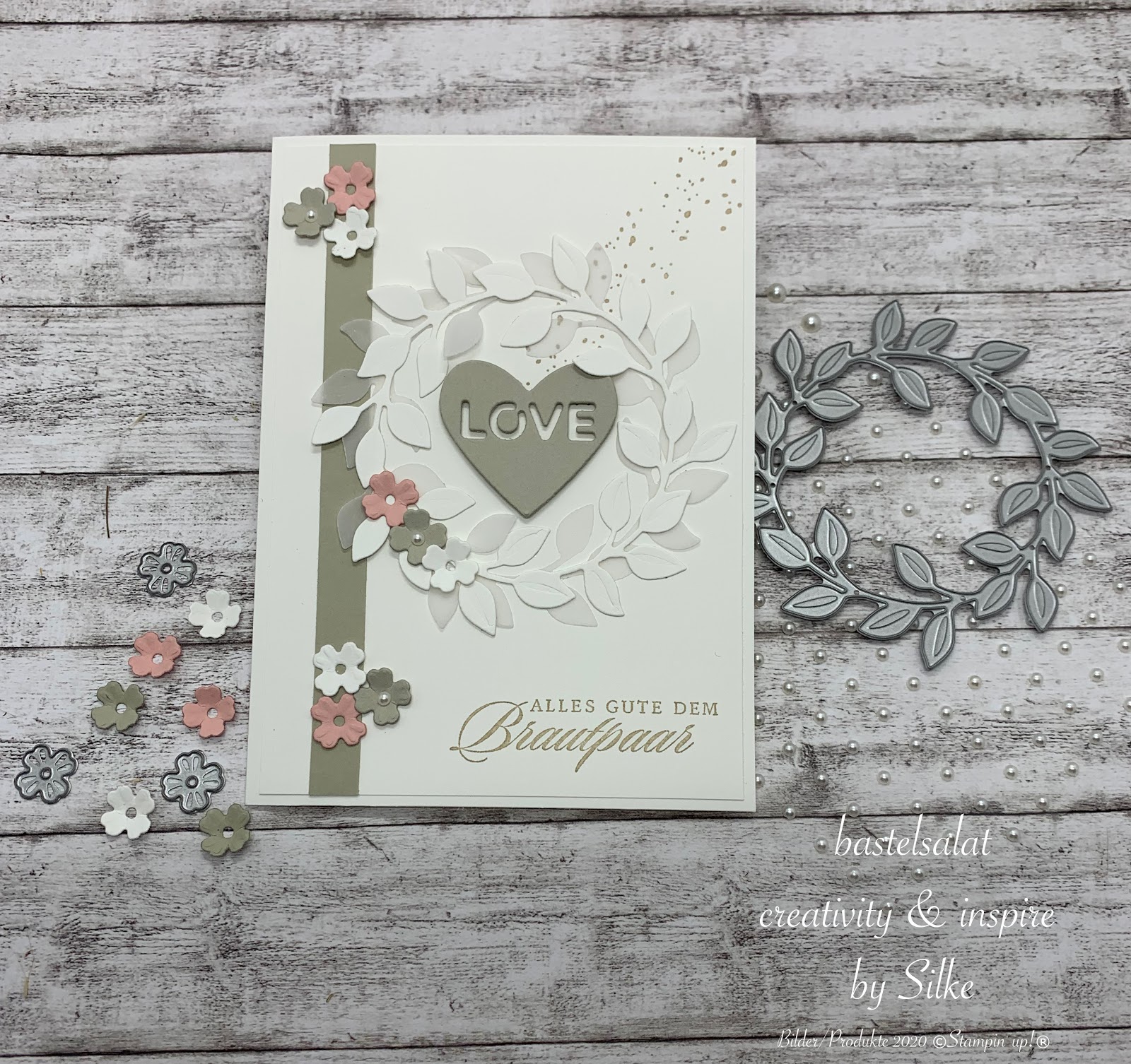 Das tolle Herz und die niedlichen kleinen Blüten findet Ihr auch bei den Stanzformen „Schmück den Kranz“. Noch ein paar Farbkleckse (Set Für alle Zeit), ein schöner Spruch (Set Ein Leben Lang) und schon war die Karte fast fertig. Den letzten Schliff bekam sie dann noch mit ein paar kleinen Perlen.
