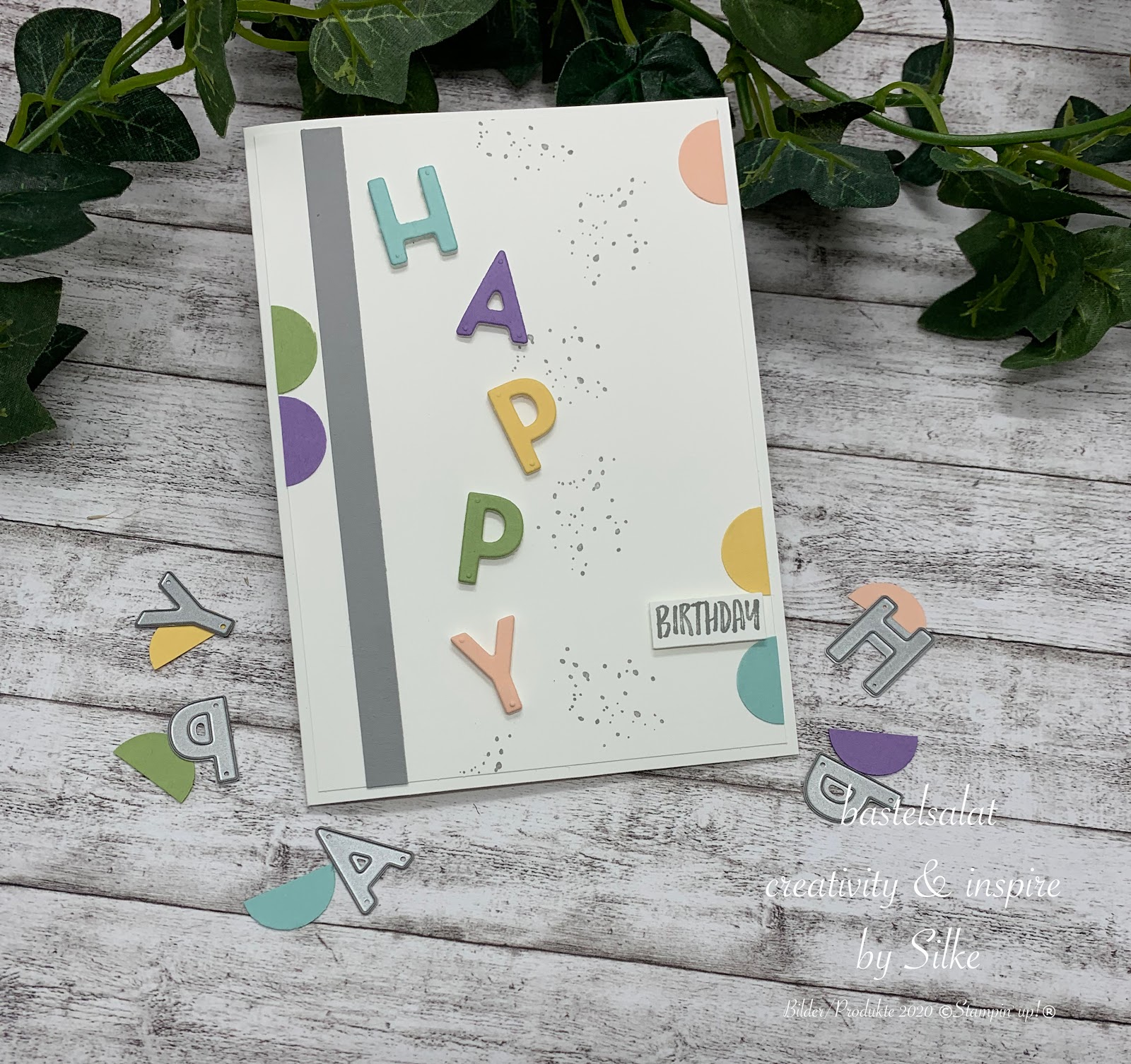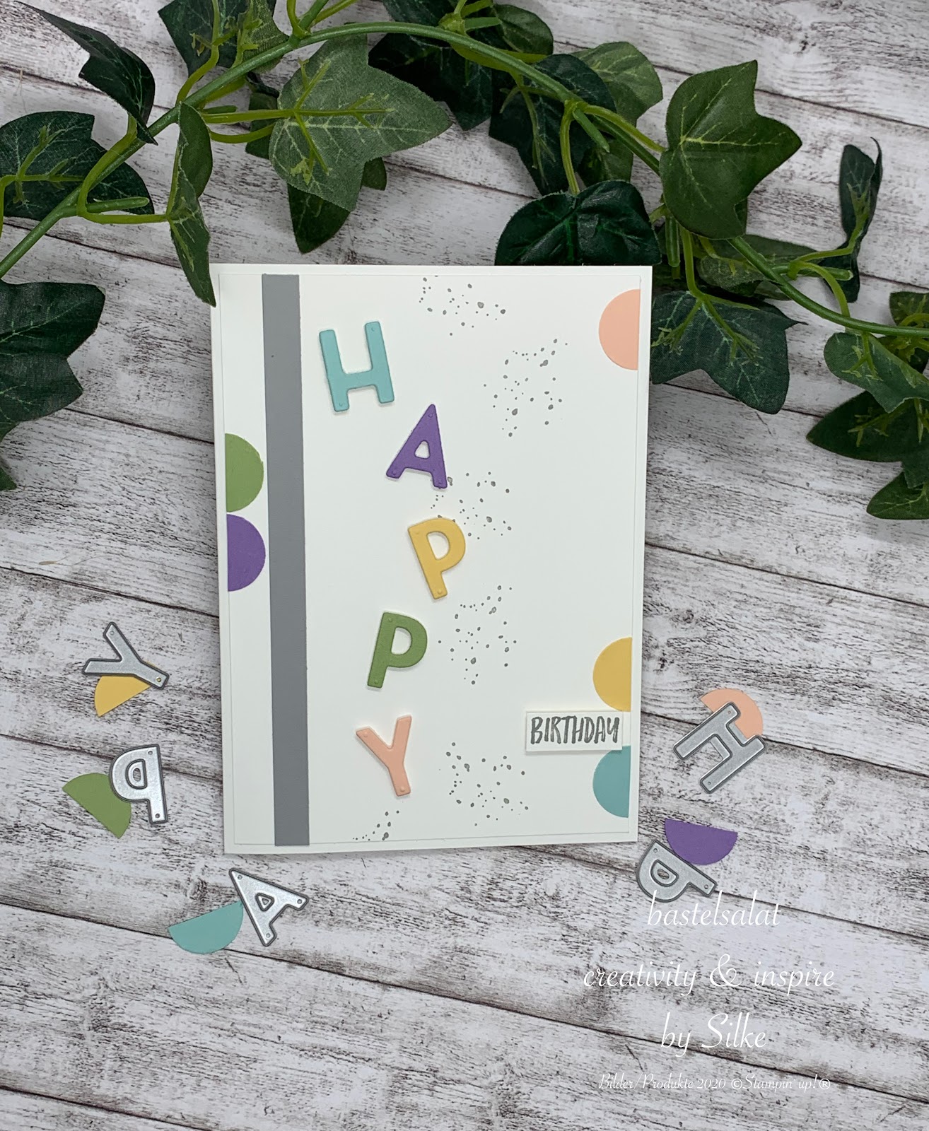 Ein paar schiefergraue Farbkleckse mit einem Stempel aus dem Set „Für alle Zeit„, ein paar halbierte, ausgestanzte Kreise (3/4“), noch ein kleines Birthday aus dem Stempelset „Zany Zebras“ und schon war die Karte fertig.