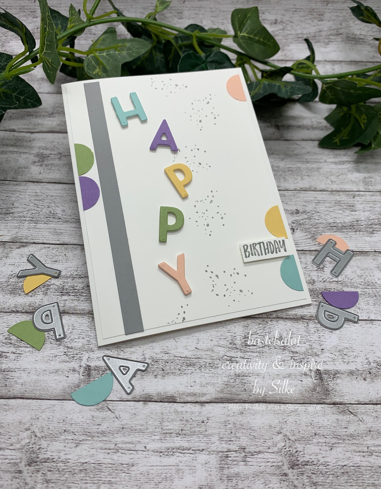 Eine relativ schlichte, aber durch die verwendete Pastellfarben doch etwas aufgelockerte Geburtstagskarte ist von meinem Basteltisch gehüpft.