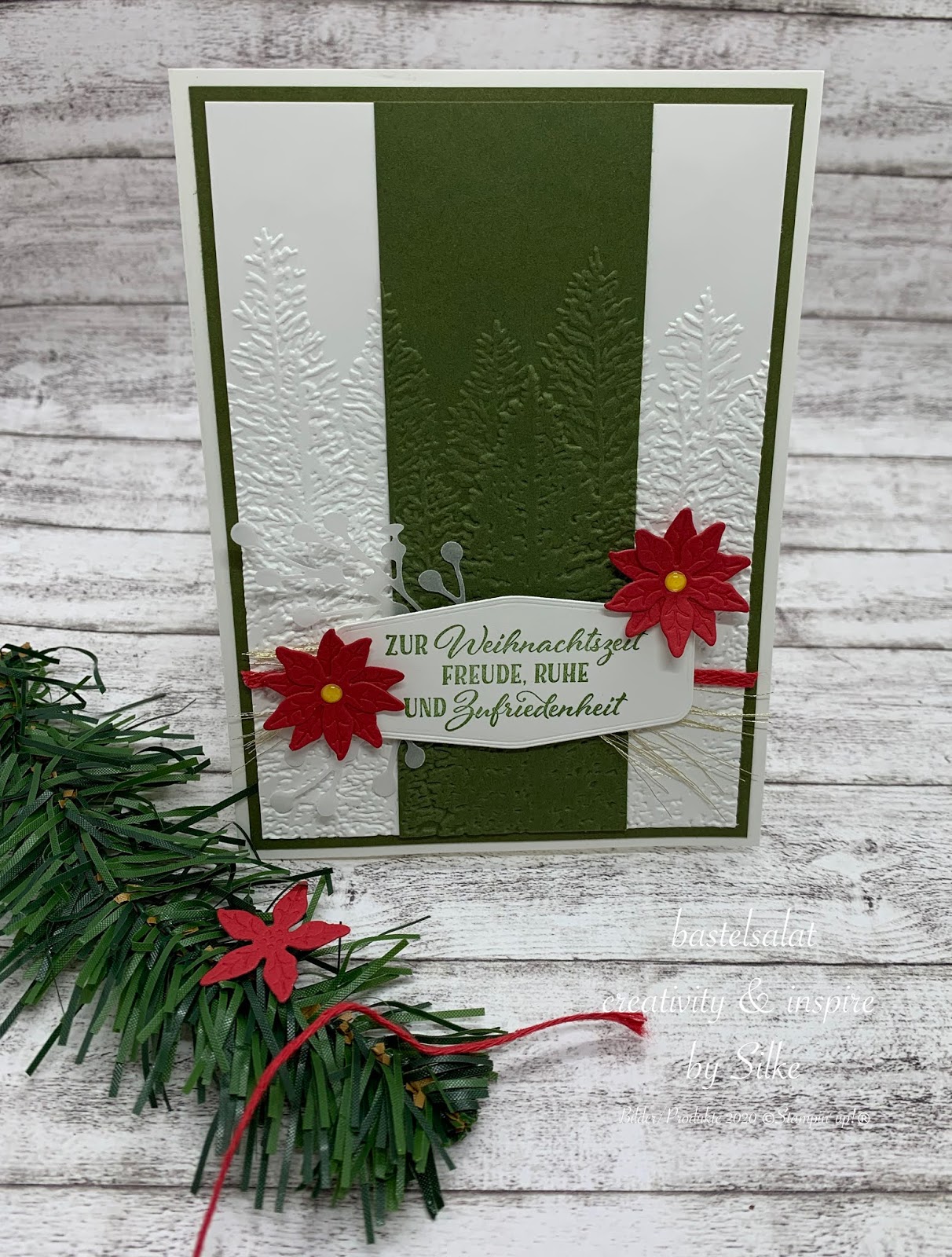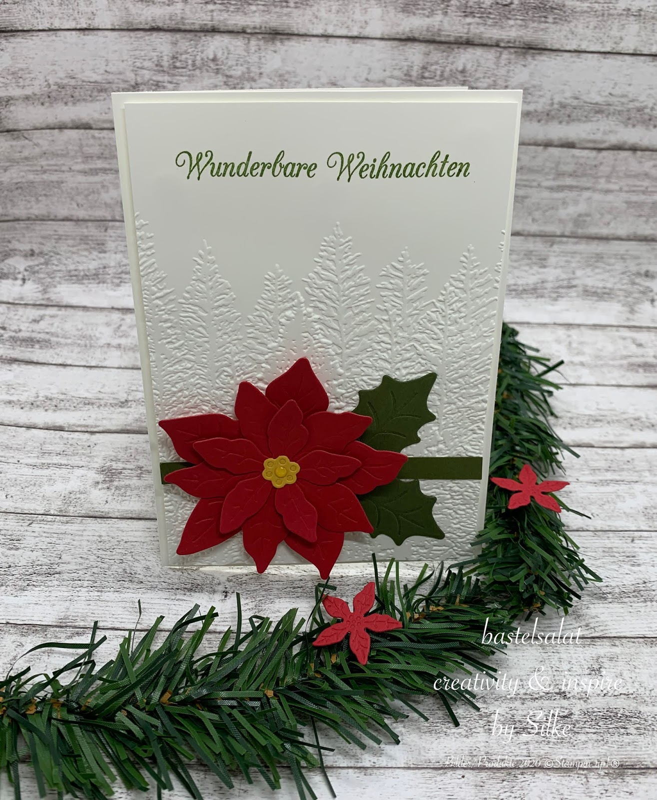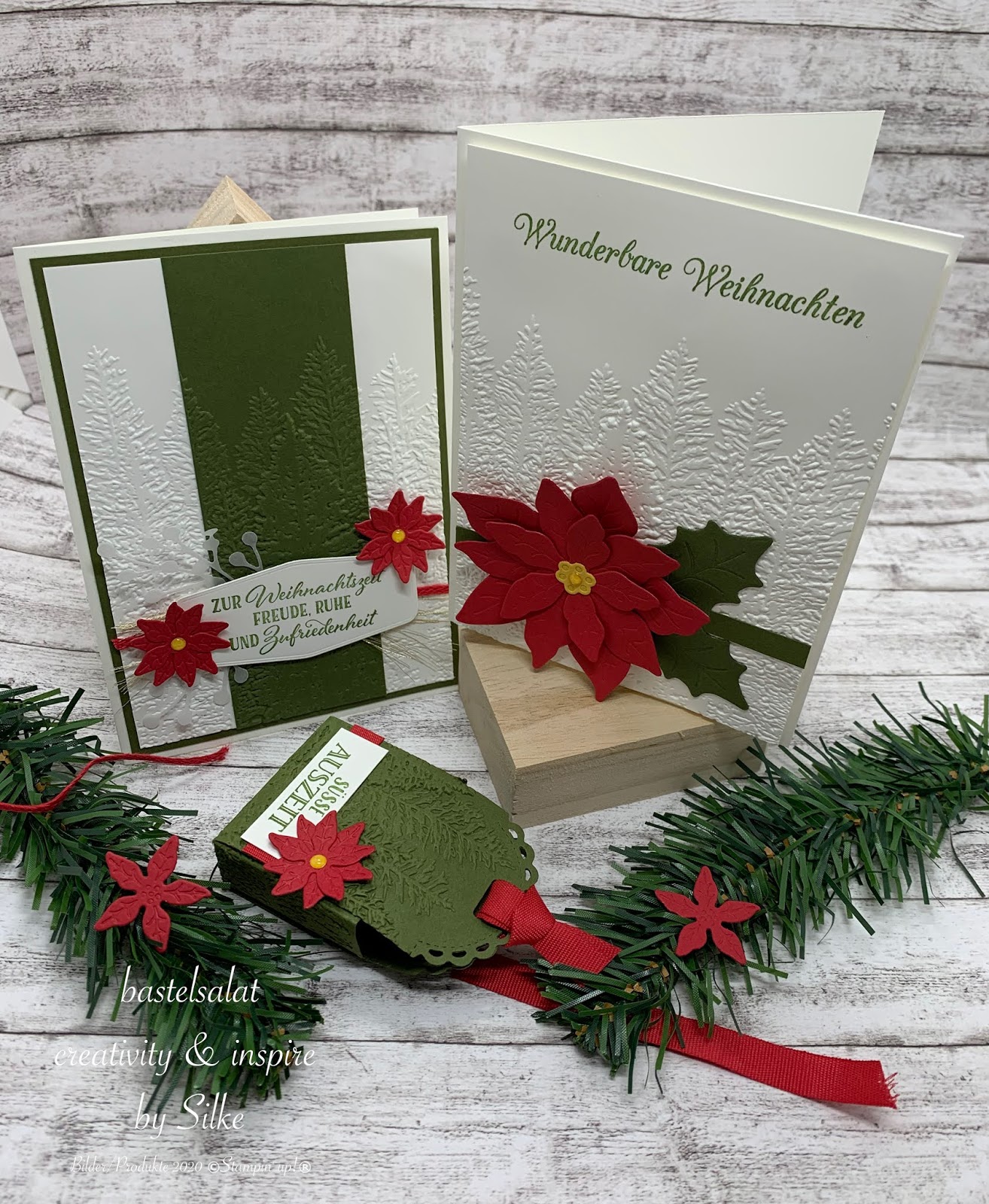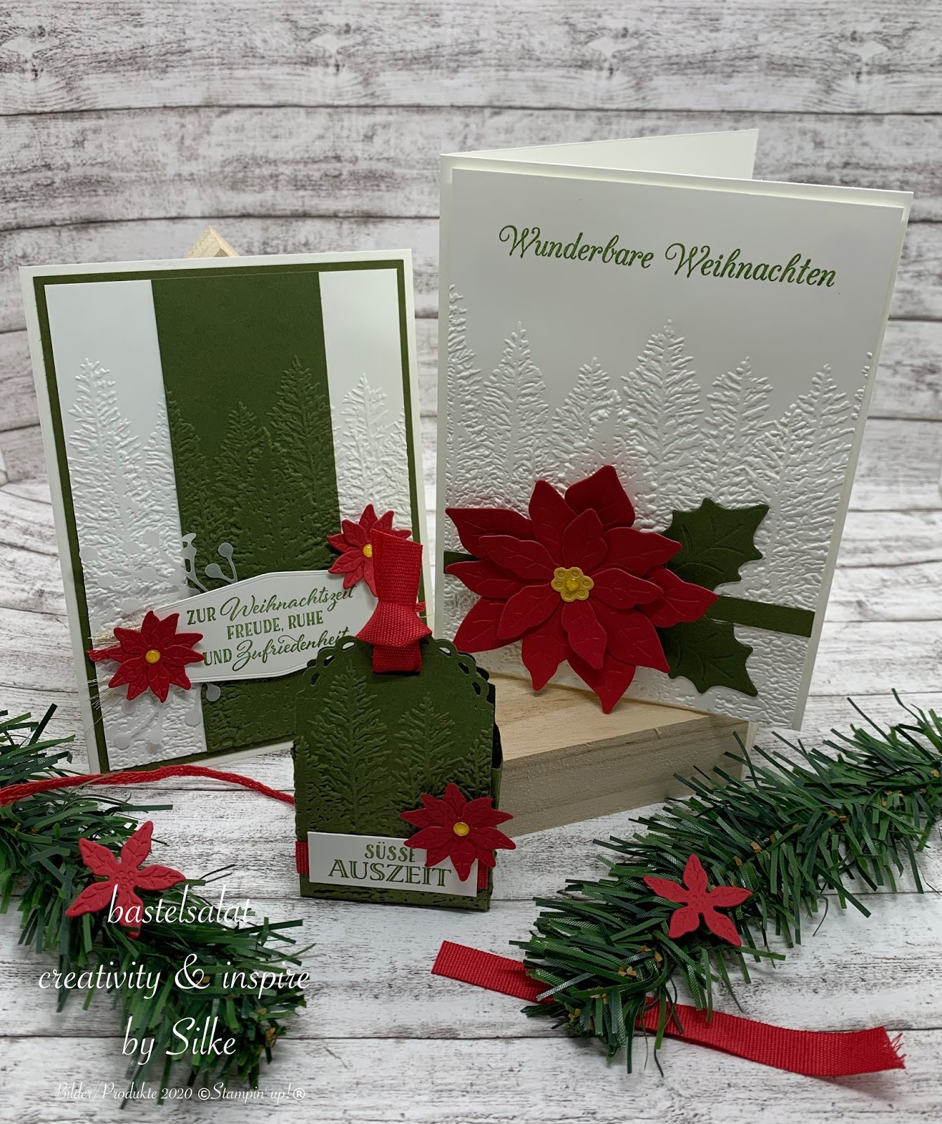 Bei allen 3 Projekten habe ich mit der 3D Prägeform Nadelwald, Stanzformen Weihnachtsstern und Farbkarton in Waldmoos, Glutrot und Flüsterweiß gearbeitet.