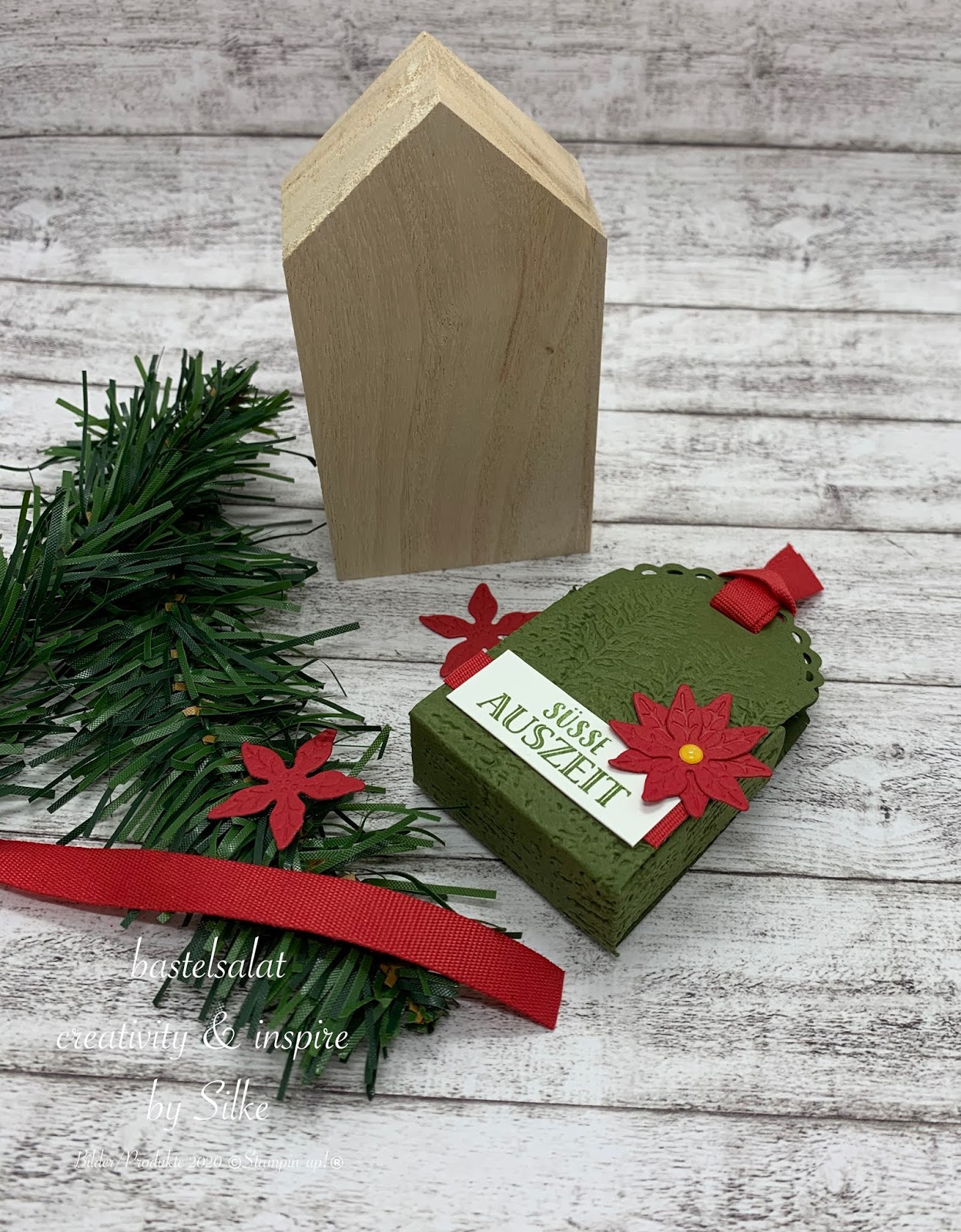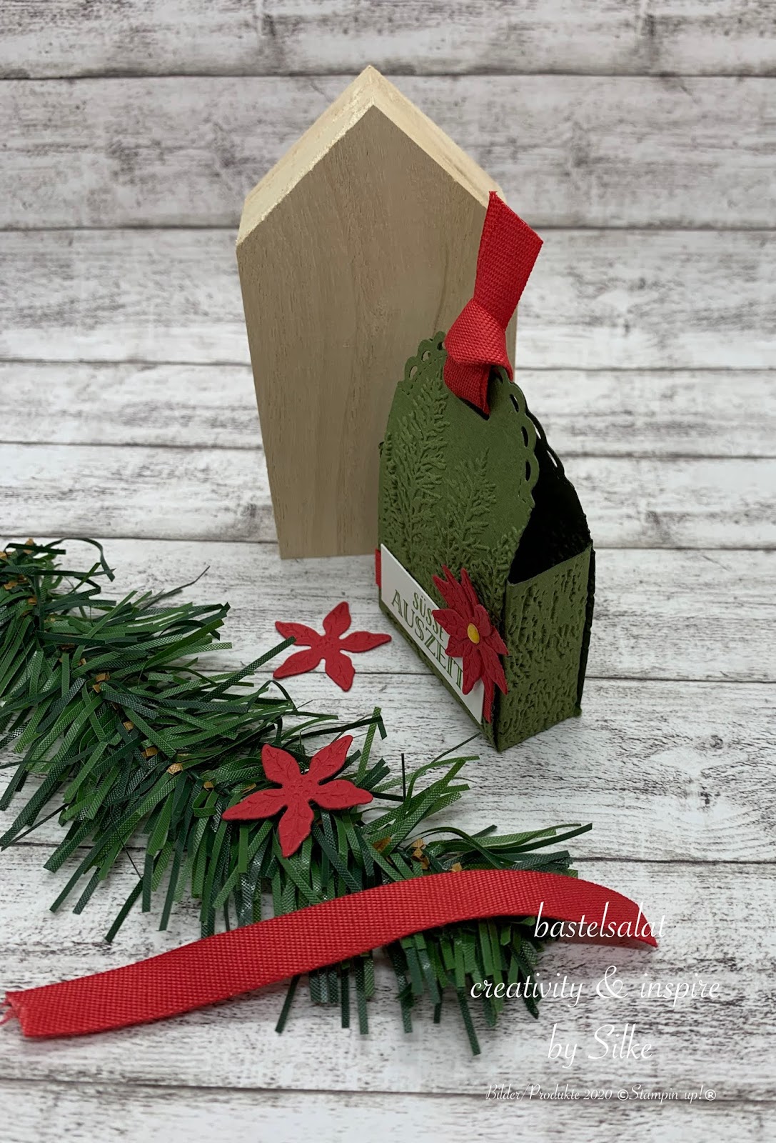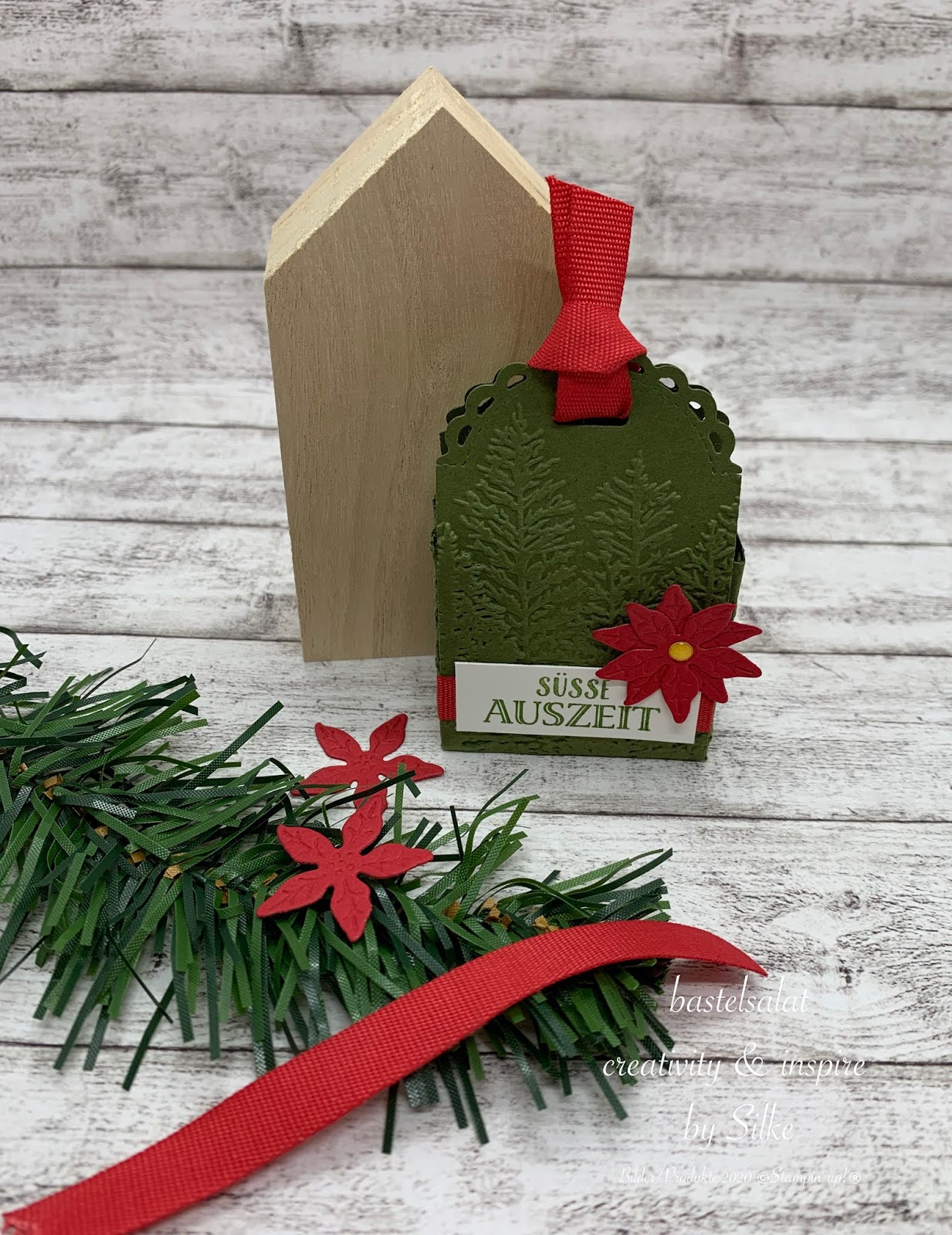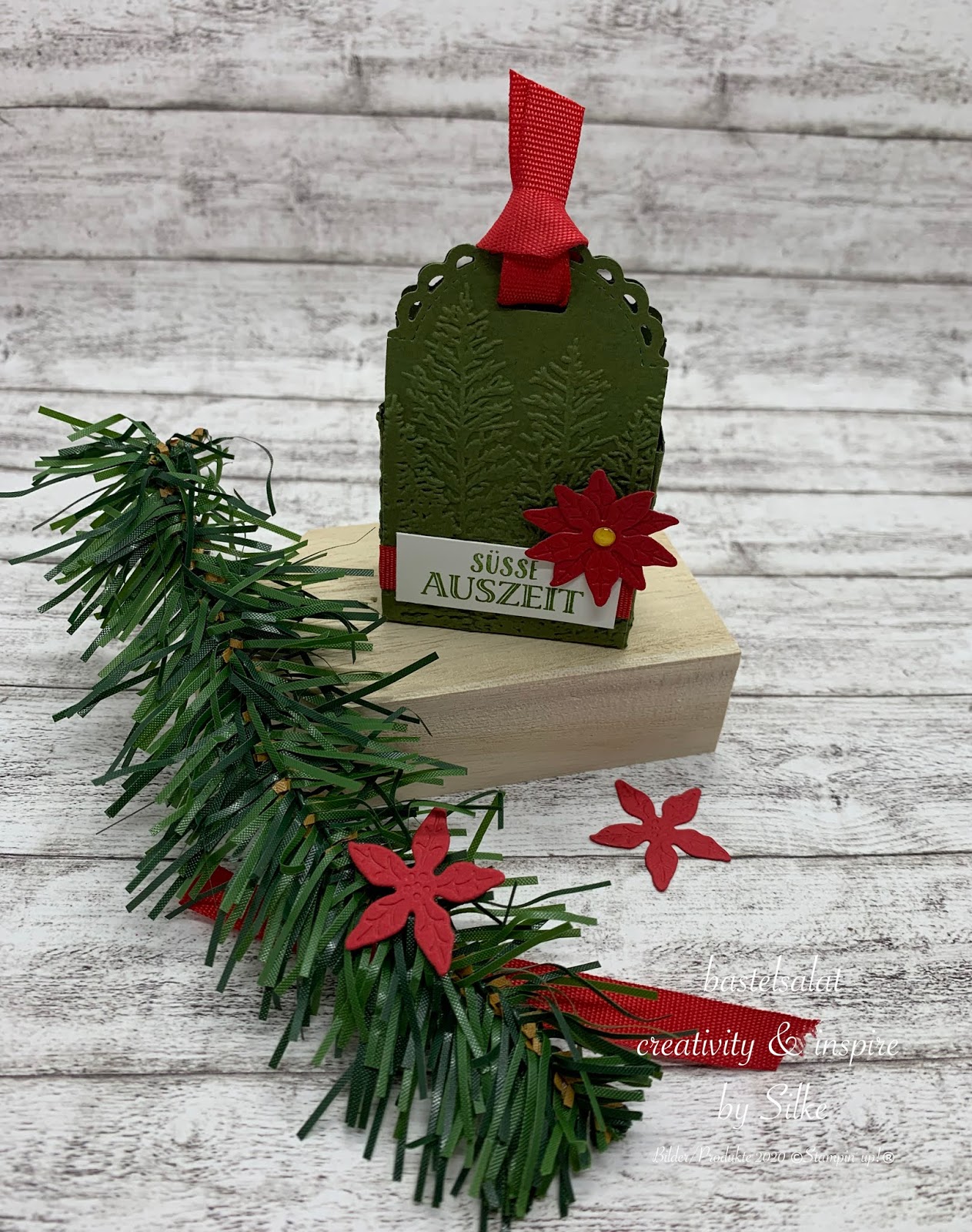 Bei allen 3 Projekten habe ich mit der 3D Prägeform Nadelwald, Stanzformen Weihnachtsstern und Farbkarton in Waldmoos, Glutrot und Flüsterweiß gearbeitet.